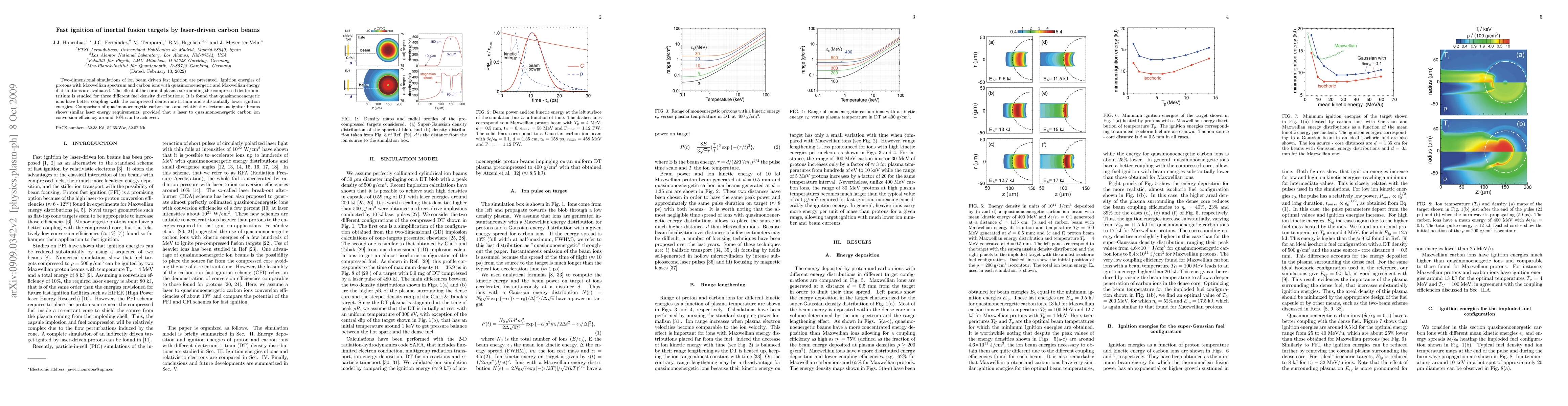 This paper presents simulations of ion beam driven fast ignition for inertial fusion, finding that quasimonoenergetic carbon ions achieve better coupling and lower ignition energies compared to Maxwellian ions. The study also compares carbon ions to relativistic electrons, suggesting similar laser energy requirements if a 10% conversion efficiency is achieved.