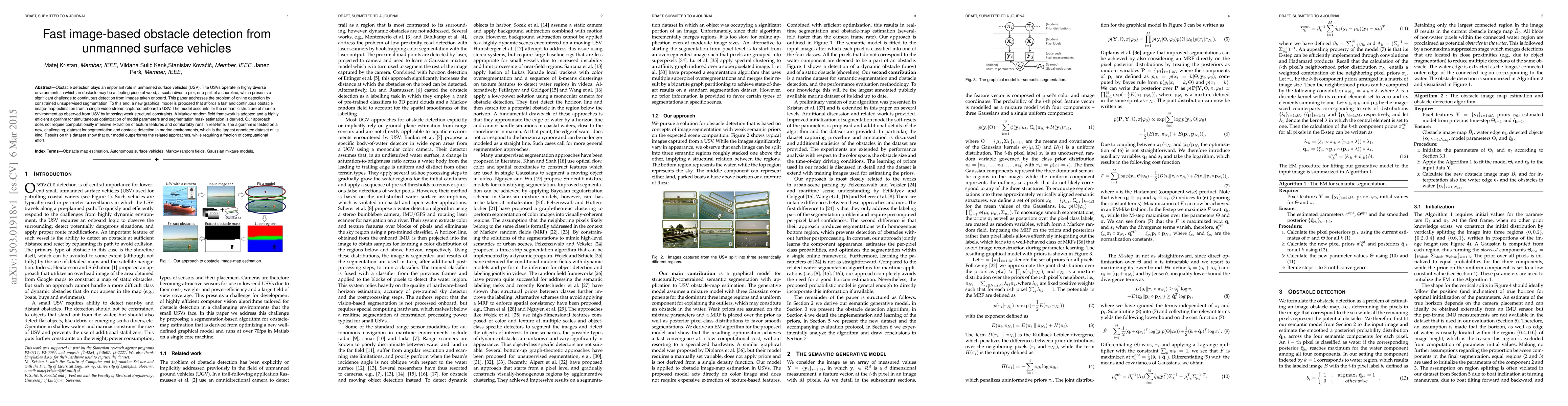 This research introduces a fast, real-time graphical model for obstacle detection in marine environments using unmanned surface vehicles (USVs). The model, based on a Markov random field framework, efficiently segments obstacles from video streams without needing computationally intensive texture feature extraction. It outperforms related approaches on a new, large-scale annotated dataset, requiring less computational effort.