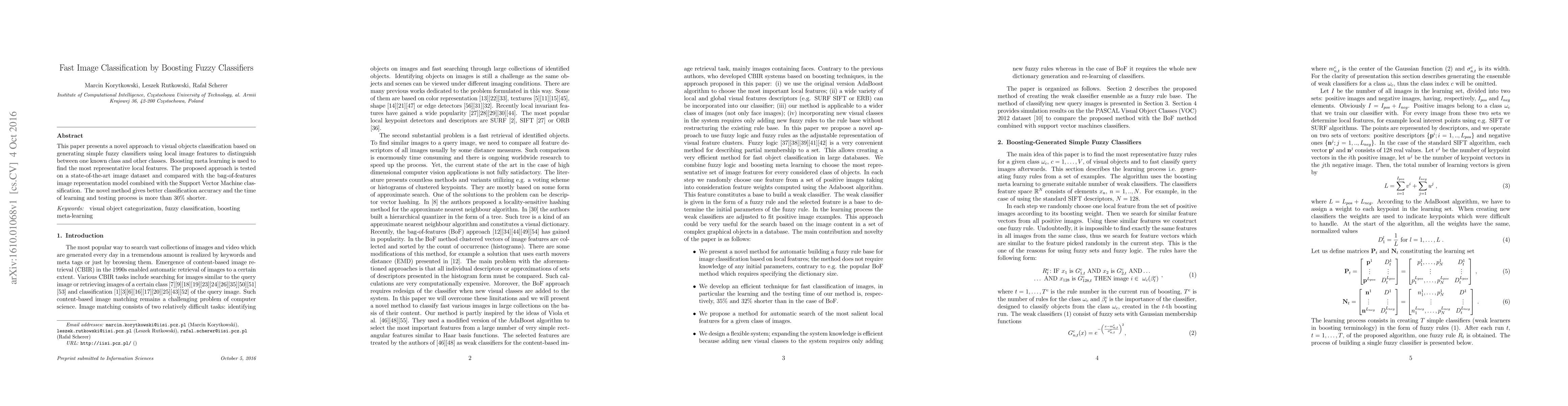 This paper presents a novel approach to visual objects classification based on generating simple fuzzy classifiers using local image features to distinguish between one known class and other classes. Boosting meta learning is used to find the most representative local features. The proposed approach is tested on a state-of-the-art image dataset and compared with the bag-of-features image representation model combined with the Support Vector Machine classification. The novel method gives better classification accuracy and the time of learning and testing process is more than 30% shorter.