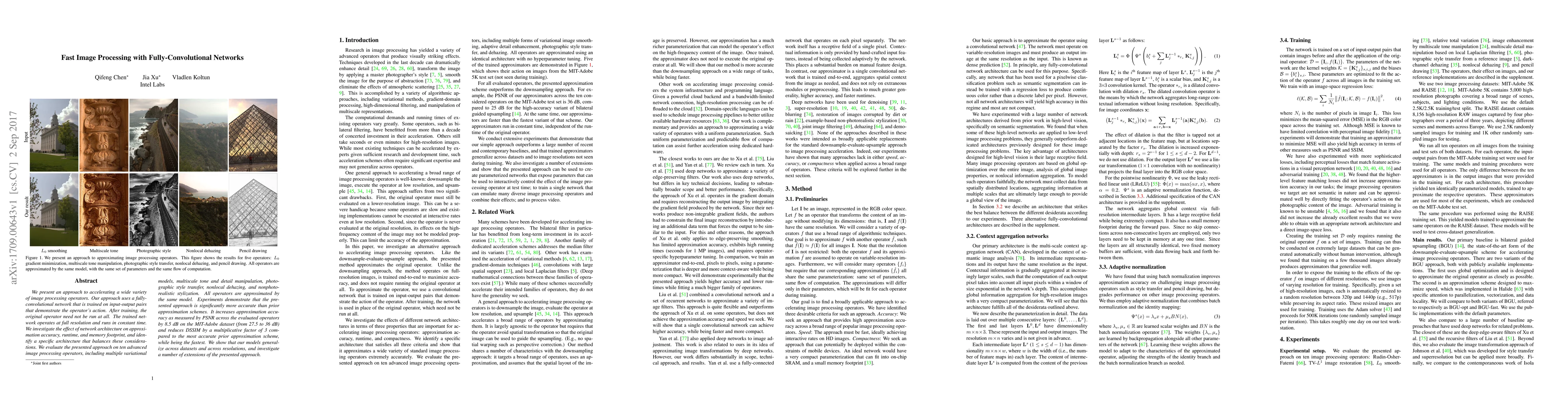 We present an approach to accelerating a wide variety of image processing operators. Our approach uses a fully-convolutional network that is trained on input-output pairs that demonstrate the operator's action. After training, the original operator need not be run at all. The trained network operates at full resolution and runs in constant time. We investigate the effect of network architecture on approximation accuracy, runtime, and memory footprint, and identify a specific architecture that balances these considerations. We evaluate the presented approach on ten advanced image processing operators, including multiple variational models, multiscale tone and detail manipulation, photographic style transfer, nonlocal dehazing, and nonphotorealistic stylization. All operators are approximated by the same model. Experiments demonstrate that the presented approach is significantly more accurate than prior approximation schemes. It increases approximation accuracy as measured by PSNR across the evaluated operators by 8.5 dB on the MIT-Adobe dataset (from 27.5 to 36 dB) and reduces DSSIM by a multiplicative factor of 3 compared to the most accurate prior approximation scheme, while being the fastest. We show that our models generalize across datasets and across resolutions, and investigate a number of extensions of the presented approach. The results are shown in the supplementary video at https://youtu.be/eQyfHgLx8Dc