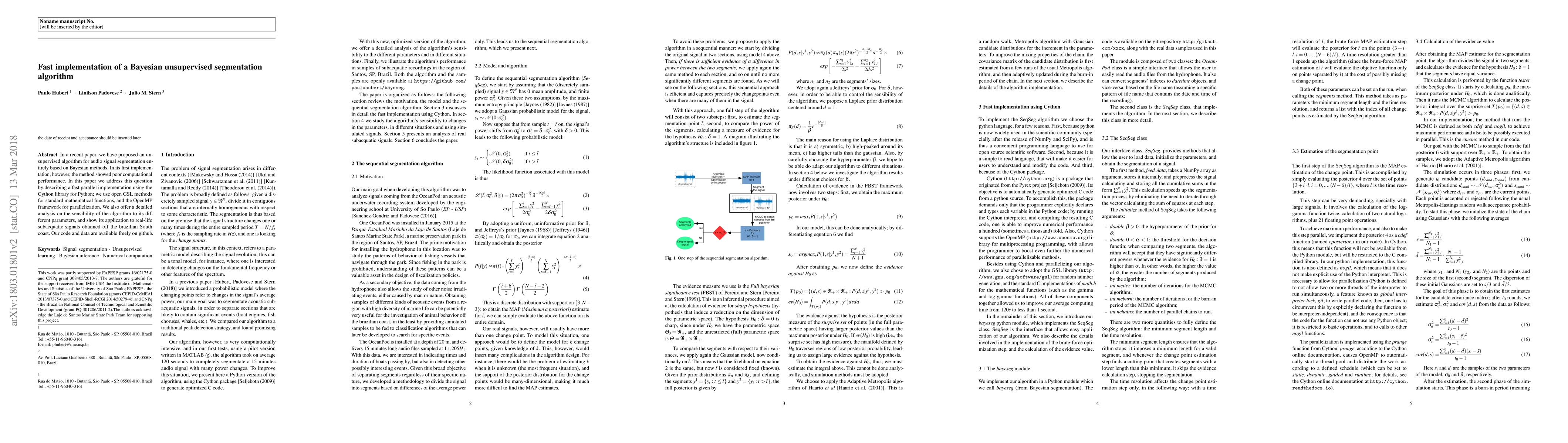 In a recent paper, we have proposed an unsupervised algorithm for audio signal segmentation entirely based on Bayesian methods. In its first implementation, however, the method showed poor computational performance. In this paper we address this question by describing a fast parallel implementation using the Cython library for Python; we use open GSL methods for standard mathematical functions, and the OpenMP framework for parallelization. We also offer a detailed analysis on the sensibility of the algorithm to its different parameters, and show its application to real-life subacquatic signals obtained off the brazilian South coast. Our code and data are available freely on github.