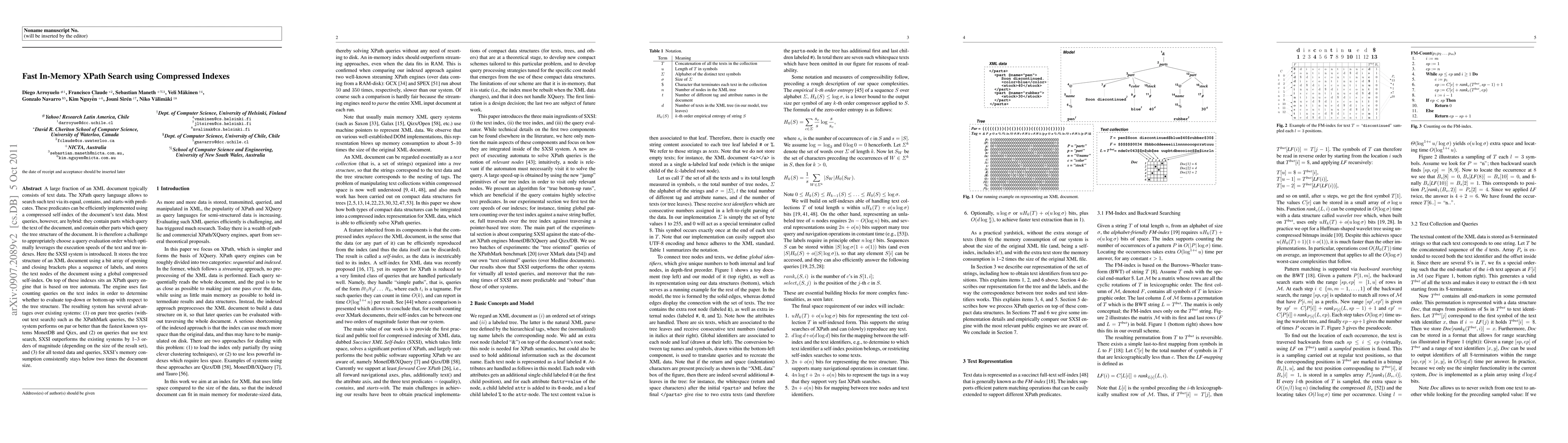 The paper introduces the SXSI system for fast in-memory XPath search over compressed text and tree indexes, achieving significant performance improvements over existing systems, especially for queries involving text search. The system dynamically determines the optimal query evaluation order using tree automata and fast counting queries on the text index.