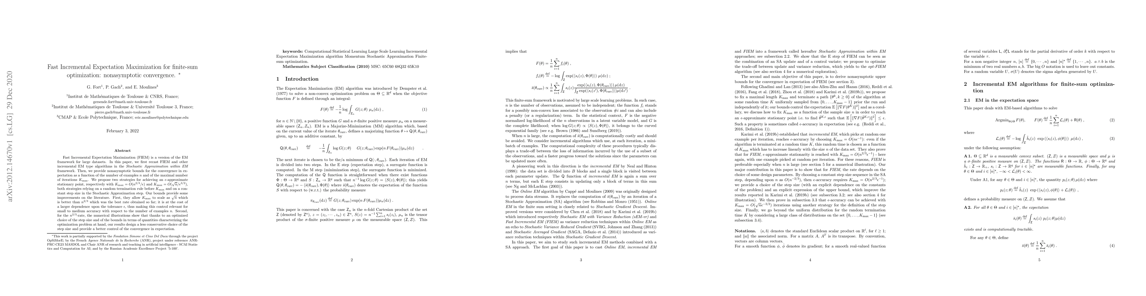 A new algorithm called Fast Incremental Expectation Maximization (FIEM) is proposed for large datasets, offering nonasymptotic convergence bounds and scaling as √ n with a tolerance-dependent step size.