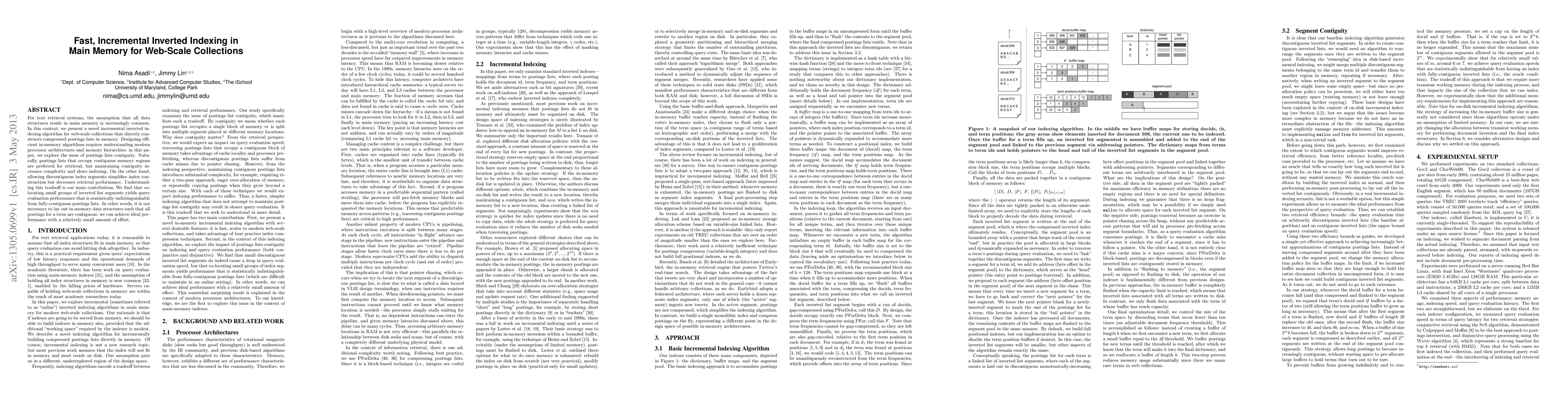 This paper introduces an efficient incremental inverted indexing algorithm for web-scale text retrieval systems that constructs compressed postings lists in main memory. The authors explore the trade-off between index construction complexity and retrieval performance, finding that co-locating small inverted list segments can achieve near-optimal query performance without requiring full contiguity.