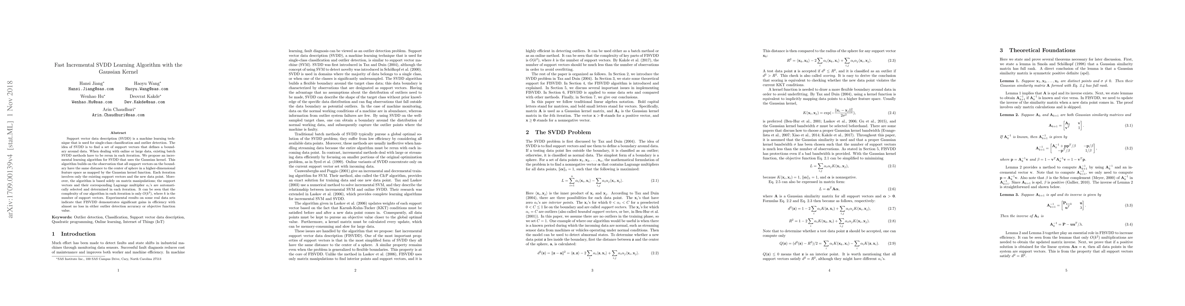 This paper introduces an efficient incremental learning algorithm for Support Vector Data Description (SVDD) using the Gaussian kernel, which significantly reduces computational complexity to O(k²) per iteration, enabling faster processing of online or large datasets while maintaining accuracy in outlier detection. Experimental results show notable efficiency gains with minimal loss in performance.