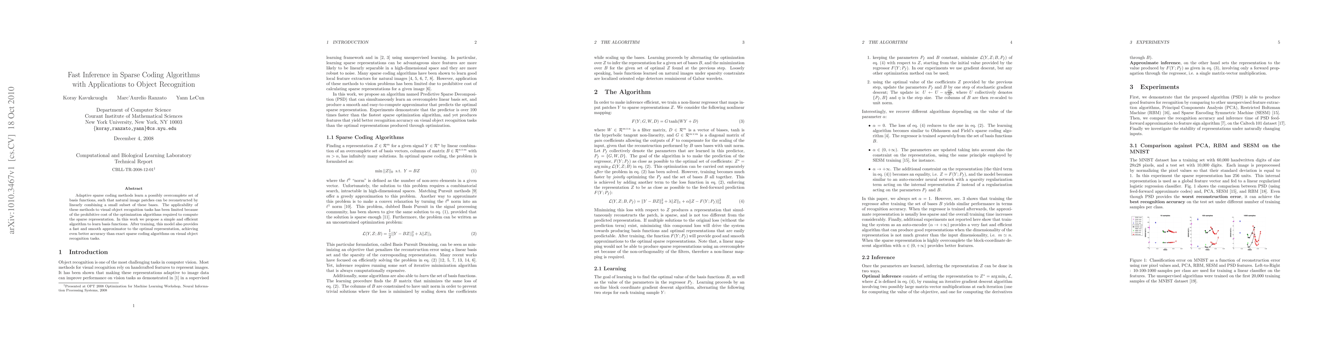 This paper proposes an efficient algorithm for learning sparse coding basis functions, which enables fast and accurate inference for visual object recognition, outperforming exact sparse coding methods in recognition tasks.