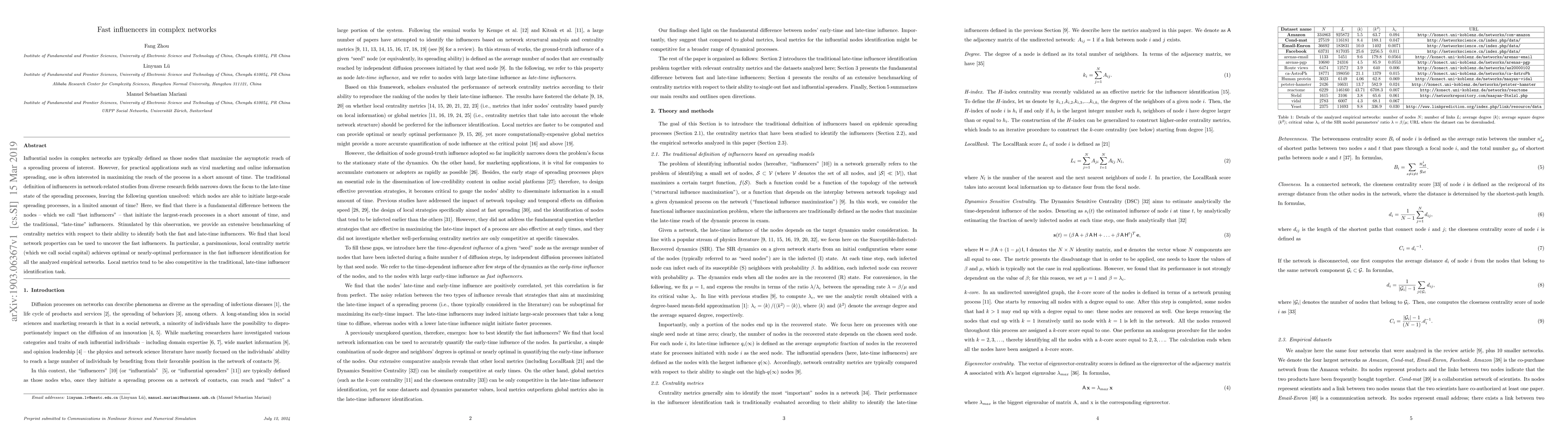 Influential nodes in complex networks are typically defined as those nodes that maximize the asymptotic reach of a spreading process of interest. However, for practical applications such as viral marketing and online information spreading, one is often interested in maximizing the reach of the process in a short amount of time. The traditional definition of influencers in network-related studies from diverse research fields narrows down the focus to the late-time state of the spreading processes, leaving the following question unsolved: which nodes are able to initiate large-scale spreading processes, in a limited amount of time? Here, we find that there is a fundamental difference between the nodes -- which we call "fast influencers" -- that initiate the largest-reach processes in a short amount of time, and the traditional, "late-time" influencers. Stimulated by this observation, we provide an extensive benchmarking of centrality metrics with respect to their ability to identify both the fast and late-time influencers. We find that local network properties can be used to uncover the fast influencers. In particular, a parsimonious, local centrality metric (which we call social capital) achieves optimal or nearly-optimal performance in the fast influencer identification for all the analyzed empirical networks. Local metrics tend to be also competitive in the traditional, late-time influencer identification task.