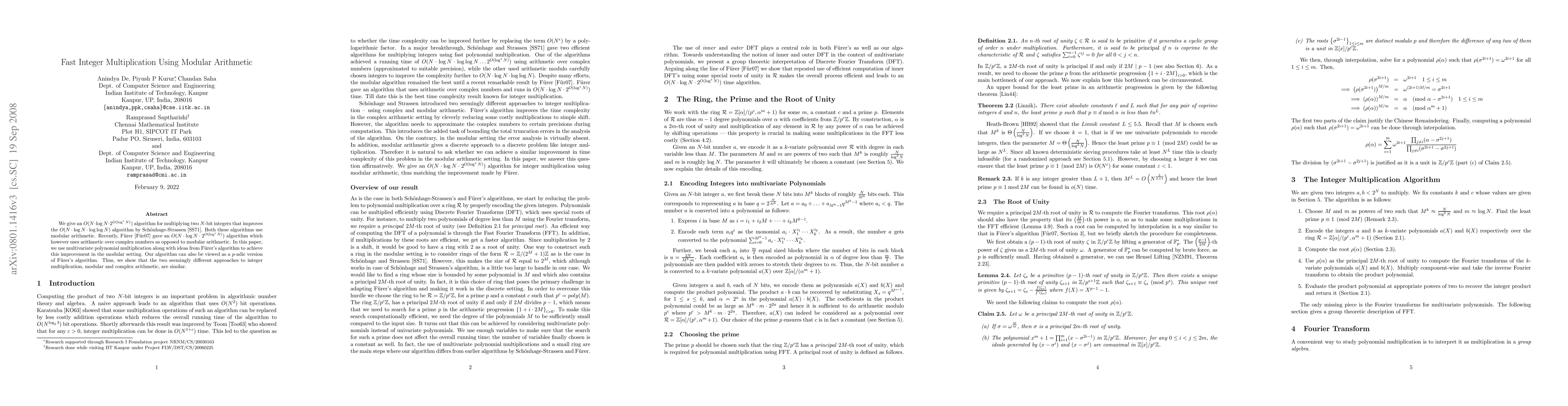 This paper presents an improved $O(N\cdot \log N\cdot 2^{O(\log^*N)})$ algorithm for multiplying $N$-bit integers using modular arithmetic, surpassing the previous $O(N\cdot \log N\cdot \log\log N)$ method by Schönhage-Strassen, and shows its equivalence to Fürer's complex arithmetic approach through multivariate polynomial multiplication.