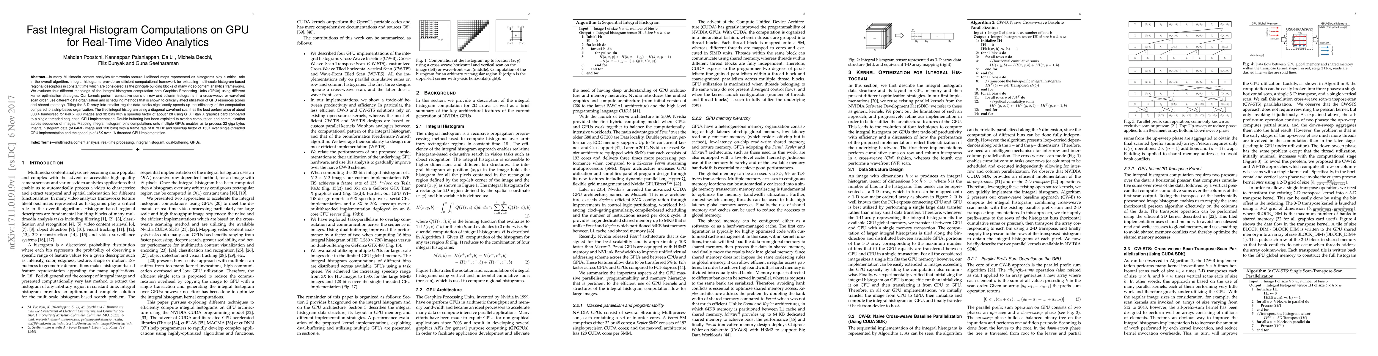 This paper evaluates various GPU-based methods for fast integral histogram computation to enhance real-time video analytics. The tiled integral histogram with a diagonal wavefront scan achieves the best performance, achieving 300.4 frames/sec for 640 x 480 images, providing a speedup factor of 120 compared to a single-threaded CPU.