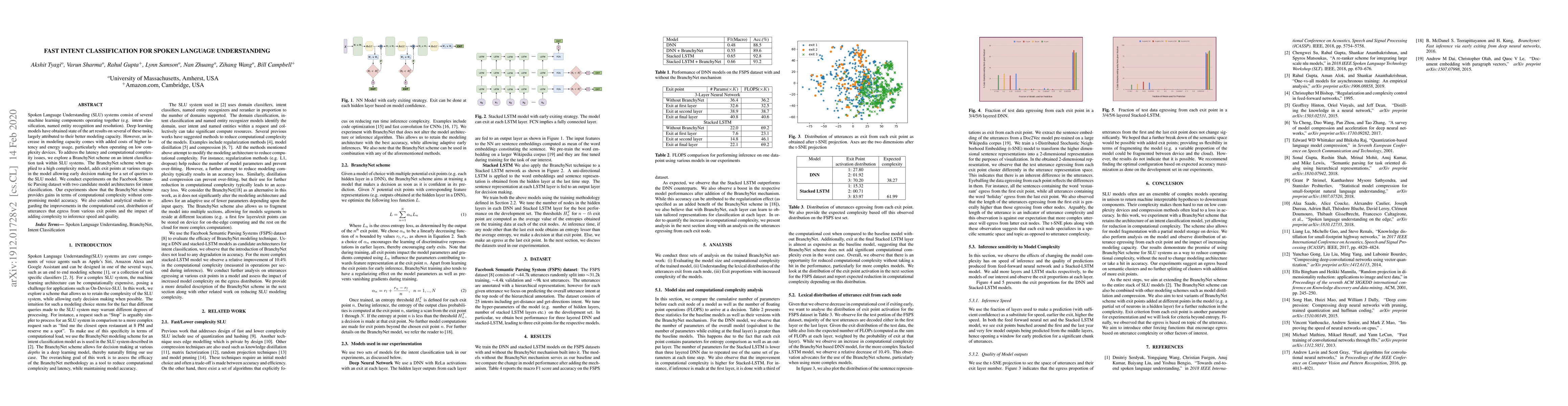 Spoken Language Understanding (SLU) systems consist of several machine learning components operating together (e.g. intent classification, named entity recognition and resolution). Deep learning models have obtained state of the art results on several of these tasks, largely attributed to their better modeling capacity. However, an increase in modeling capacity comes with added costs of higher latency and energy usage, particularly when operating on low complexity devices. To address the latency and computational complexity issues, we explore a BranchyNet scheme on an intent classification scheme within SLU systems. The BranchyNet scheme when applied to a high complexity model, adds exit points at various stages in the model allowing early decision making for a set of queries to the SLU model. We conduct experiments on the Facebook Semantic Parsing dataset with two candidate model architectures for intent classification. Our experiments show that the BranchyNet scheme provides gains in terms of computational complexity without compromising model accuracy. We also conduct analytical studies regarding the improvements in the computational cost, distribution of utterances that egress from various exit points and the impact of adding more complexity to models with the BranchyNet scheme.