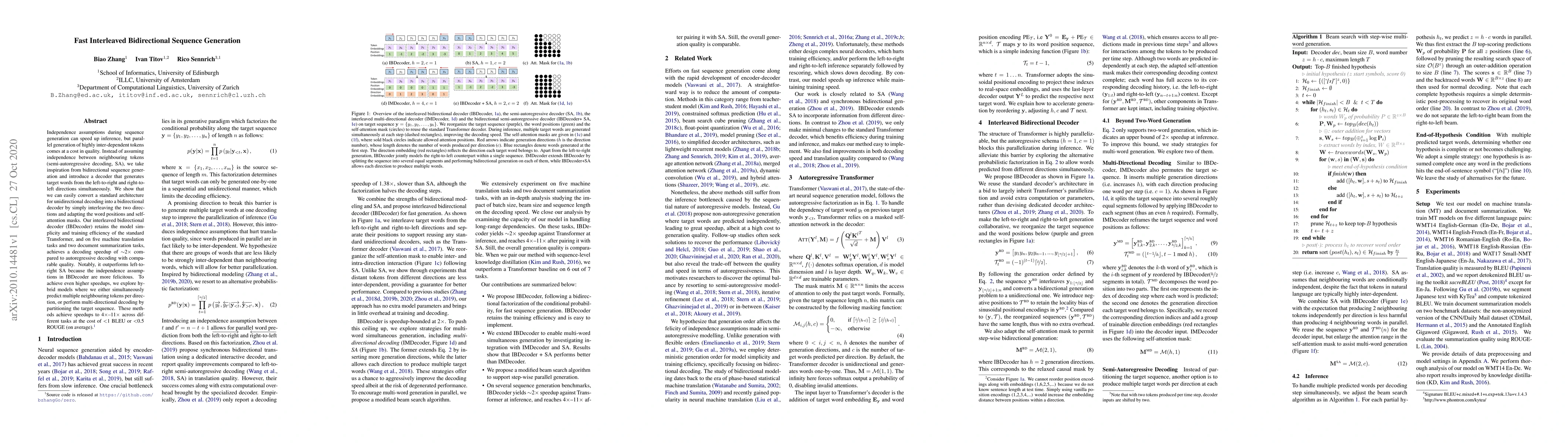 This paper proposes an interleaved bidirectional decoder (IBDecoder) for sequence generation that interleaves left-to-right and right-to-left decoding to achieve up to 2X speedup compared to autoregressive decoding while maintaining comparable quality. Hybrid models further achieve up to 11X speedups with minimal loss in translation and summarization metrics.