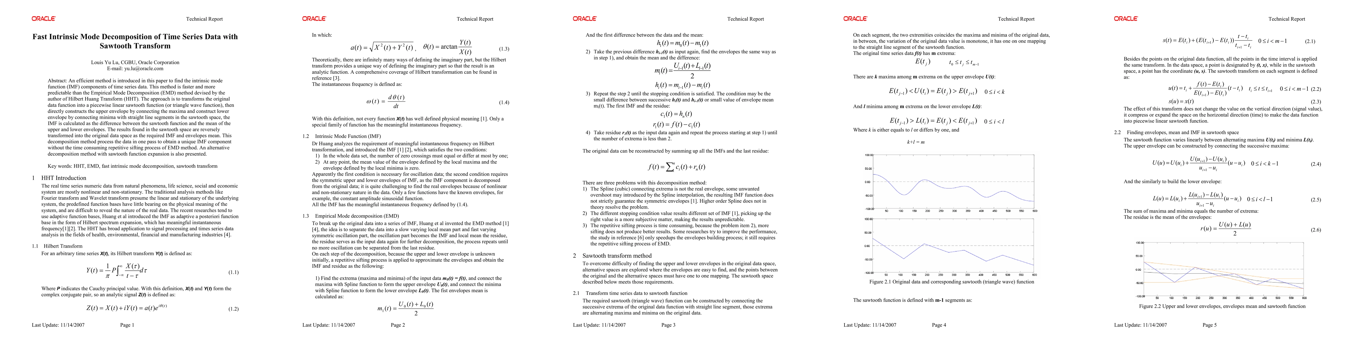 This paper proposes a fast method for intrinsic mode function decomposition of time series data using a sawtooth transform, which avoids the repetitive sifting process of EMD, achieving faster and more predictable results by constructing envelopes directly in sawtooth space and transforming back to the original data space.