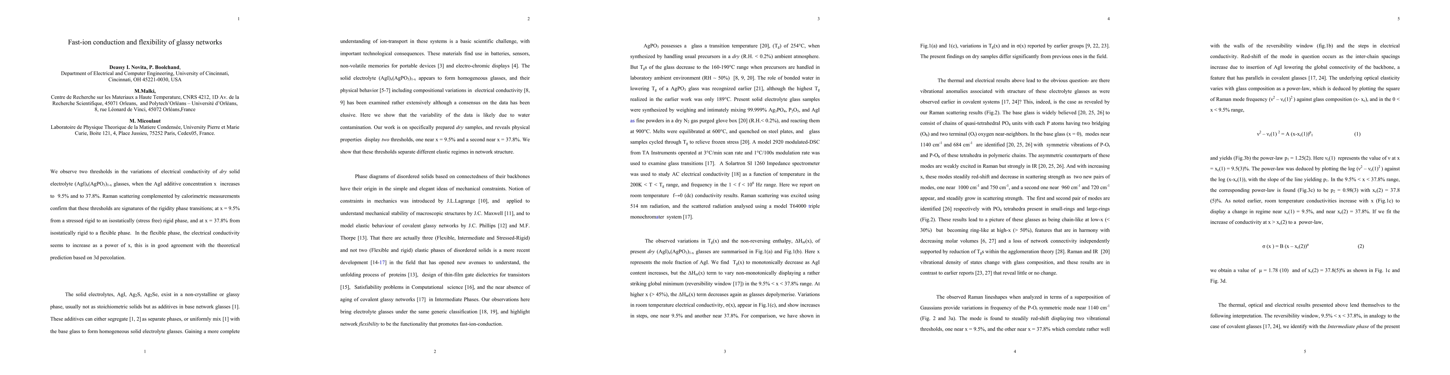 We observe two thresholds in the variations of electrical conductivity of dry solid electrolyte (AgI)x(AgPO3)1-x glasses, when the AgI additive concentration x increases to 9.5% and to 37.8%. Raman scattering complemented by calorimetric measurements confirm that these thresholds are signatures of the rigidity phase transitions; at x = 9.5% from a stressed rigid to an isostatically (stress free) rigid phase, and at x = 37.8% from isostatically rigid to a flexible phase. In the flexible phase, the electrical conductivity seems to increase as a power of x, this is in good agreement with the theoretical prediction based on 3d percolation.