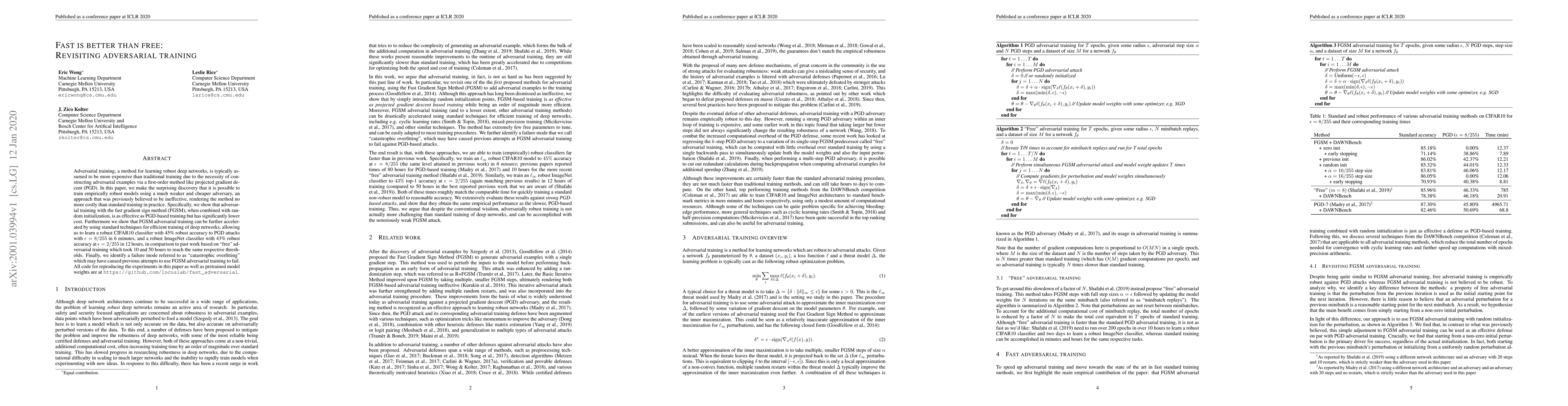 Adversarial training, a method for learning robust deep networks, is typically assumed to be more expensive than traditional training due to the necessity of constructing adversarial examples via a first-order method like projected gradient decent (PGD). In this paper, we make the surprising discovery that it is possible to train empirically robust models using a much weaker and cheaper adversary, an approach that was previously believed to be ineffective, rendering the method no more costly than standard training in practice. Specifically, we show that adversarial training with the fast gradient sign method (FGSM), when combined with random initialization, is as effective as PGD-based training but has significantly lower cost. Furthermore we show that FGSM adversarial training can be further accelerated by using standard techniques for efficient training of deep networks, allowing us to learn a robust CIFAR10 classifier with 45% robust accuracy to PGD attacks with $\epsilon=8/255$ in 6 minutes, and a robust ImageNet classifier with 43% robust accuracy at $\epsilon=2/255$ in 12 hours, in comparison to past work based on "free" adversarial training which took 10 and 50 hours to reach the same respective thresholds. Finally, we identify a failure mode referred to as "catastrophic overfitting" which may have caused previous attempts to use FGSM adversarial training to fail. All code for reproducing the experiments in this paper as well as pretrained model weights are at https://github.com/locuslab/fast_adversarial.