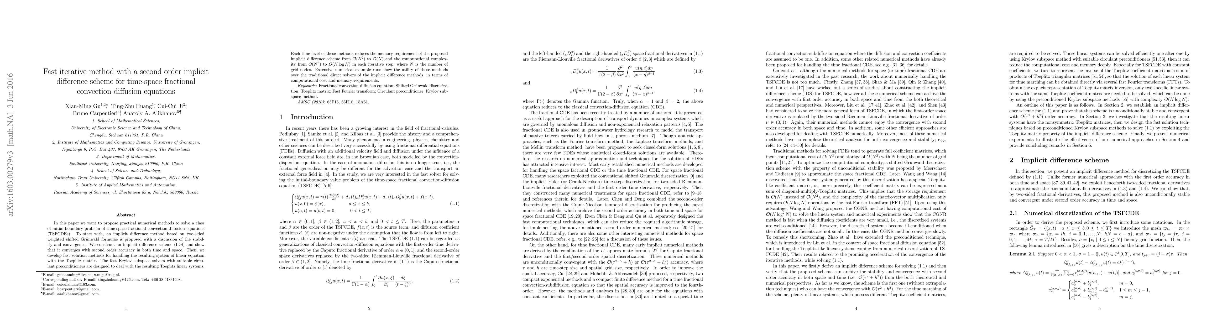 This paper proposes a second-order implicit difference scheme for solving time-space fractional convection-diffusion equations, demonstrating its stability and convergence. It also introduces fast iterative methods to efficiently solve the resulting Toeplitz linear systems, significantly reducing memory and computational complexity.