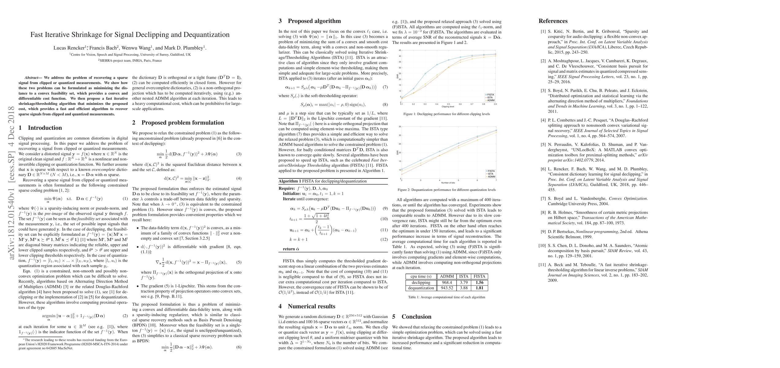 This paper proposes a fast iterative shrinkage/thresholding algorithm to recover sparse signals from clipped or quantized measurements by minimizing a convex and differentiable cost function derived from the problem's convex feasibility set. The method offers an efficient solution to the signal declipping and dequantization challenge.