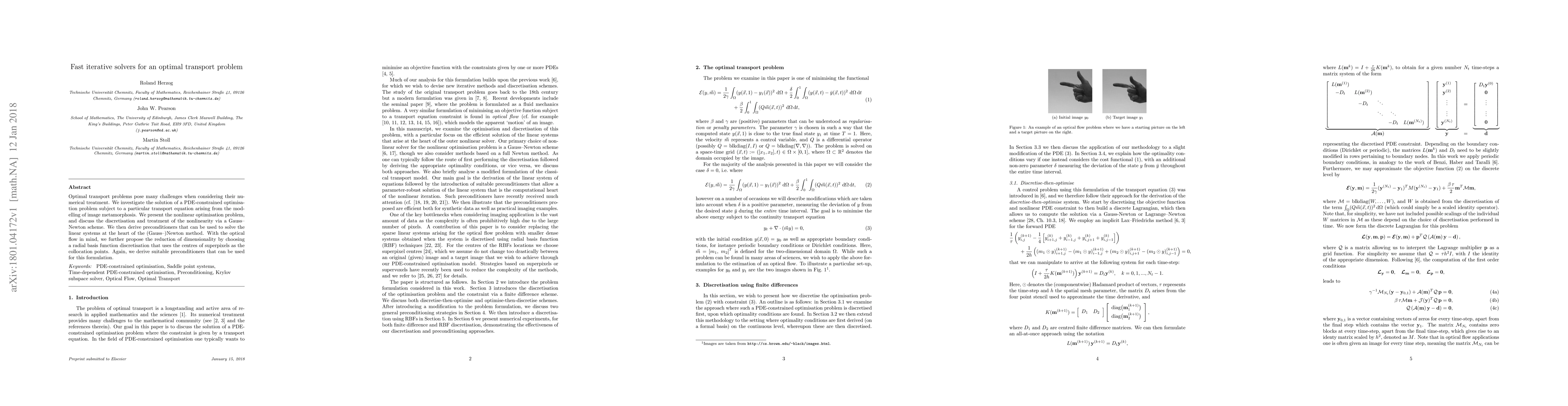 Optimal transport problems pose many challenges when considering their numerical treatment. We investigate the solution of a PDE-constrained optimisation problem subject to a particular transport equation arising from the modelling of image metamorphosis. We present the nonlinear optimisation problem, and discuss the discretisation and treatment of the nonlinearity via a Gauss--Newton scheme. We then derive preconditioners that can be used to solve the linear systems at the heart of the (Gauss--)Newton method. With the optical flow in mind, we further propose the reduction of dimensionality by choosing a radial basis function discretisation that uses the centres of superpixels as the collocation points. Again, we derive suitable preconditioners that can be used for this formulation.