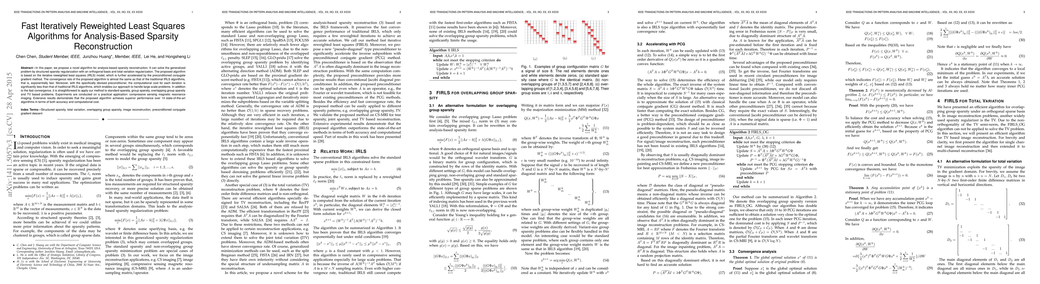 This paper introduces a fast iterative algorithm for analysis-based sparsity reconstruction using structured sparsity regularization and total variation regularization. The proposed algorithm leverages an accelerated iterative reweighted least squares model with a preconditioned conjugate gradient method, achieving exponential convergence and significantly lower computational costs compared to traditional methods.