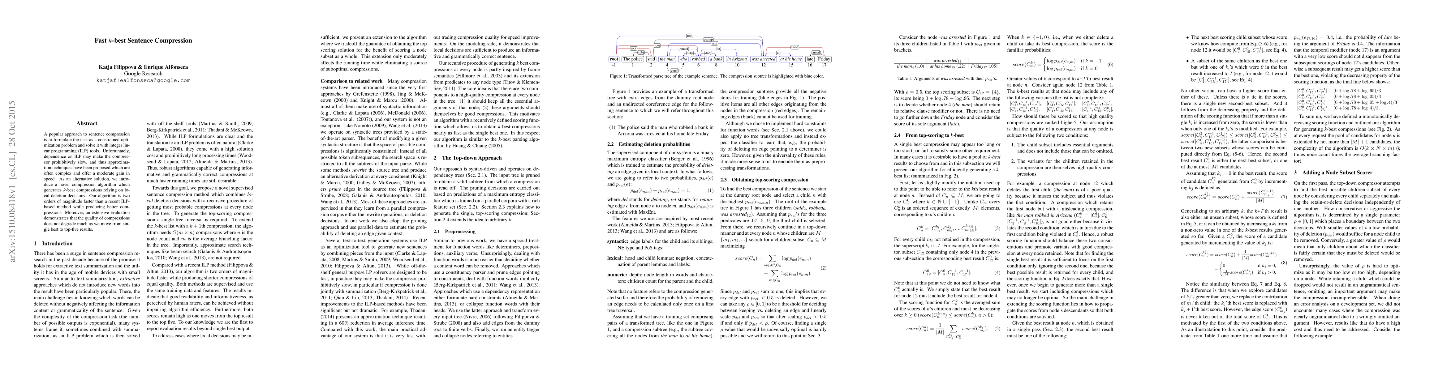 This paper introduces a novel fast k-best sentence compression algorithm that leverages local deletion decisions, achieving two orders of magnitude speed improvement over ILP-based methods while maintaining high-quality compressions, with minimal degradation in quality as the number of best compressions increases.