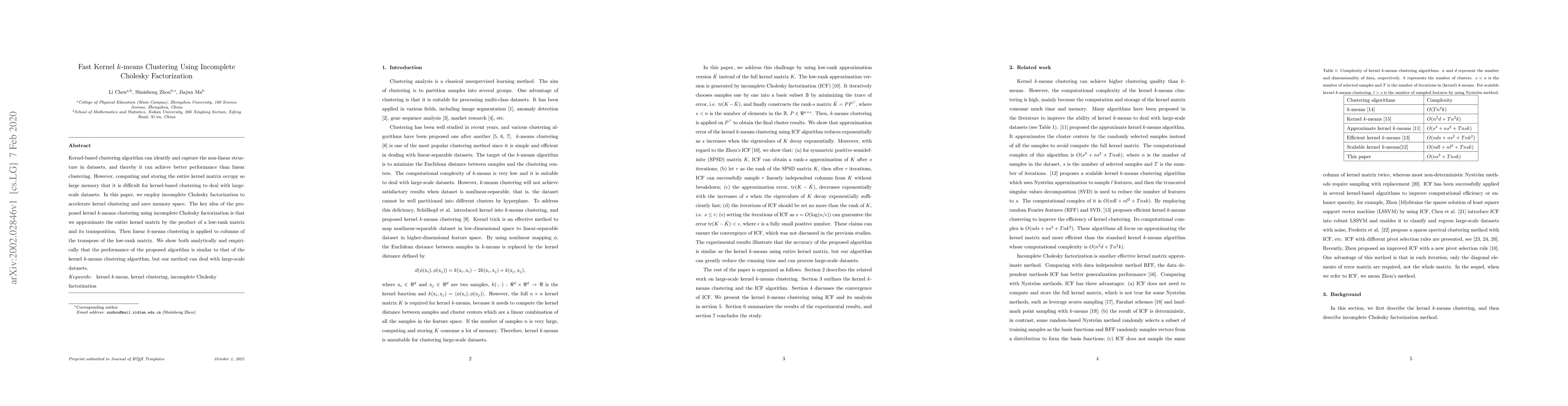 Kernel-based clustering algorithm can identify and capture the non-linear structure in datasets, and thereby it can achieve better performance than linear clustering. However, computing and storing the entire kernel matrix occupy so large memory that it is difficult for kernel-based clustering to deal with large-scale datasets. In this paper, we employ incomplete Cholesky factorization to accelerate kernel clustering and save memory space. The key idea of the proposed kernel $k$-means clustering using incomplete Cholesky factorization is that we approximate the entire kernel matrix by the product of a low-rank matrix and its transposition. Then linear $k$-means clustering is applied to columns of the transpose of the low-rank matrix. We show both analytically and empirically that the performance of the proposed algorithm is similar to that of the kernel $k$-means clustering algorithm, but our method can deal with large-scale datasets.