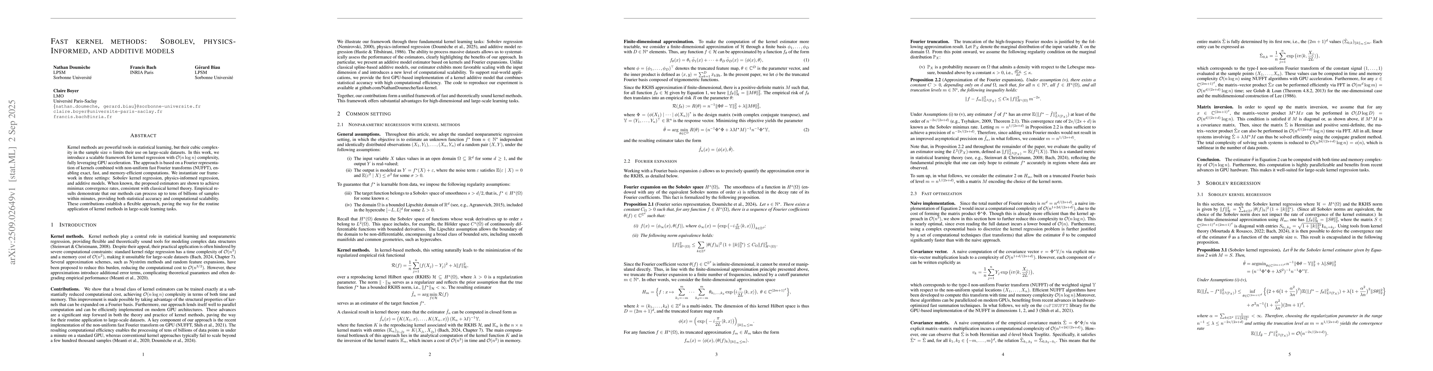 Kernel methods are powerful tools in statistical learning, but their cubic complexity in the sample size n limits their use on large-scale datasets. In this work, we introduce a scalable framework for kernel regression with O(n log n) complexity, fully leveraging GPU acceleration. The approach is based on a Fourier representation of kernels combined with non-uniform fast Fourier transforms (NUFFT), enabling exact, fast, and memory-efficient computations. We instantiate our framework in three settings: Sobolev kernel regression, physics-informed regression, and additive models. When known, the proposed estimators are shown to achieve minimax convergence rates, consistent with classical kernel theory. Empirical results demonstrate that our methods can process up to tens of billions of samples within minutes, providing both statistical accuracy and computational scalability. These contributions establish a flexible approach, paving the way for the routine application of kernel methods in large-scale learning tasks.