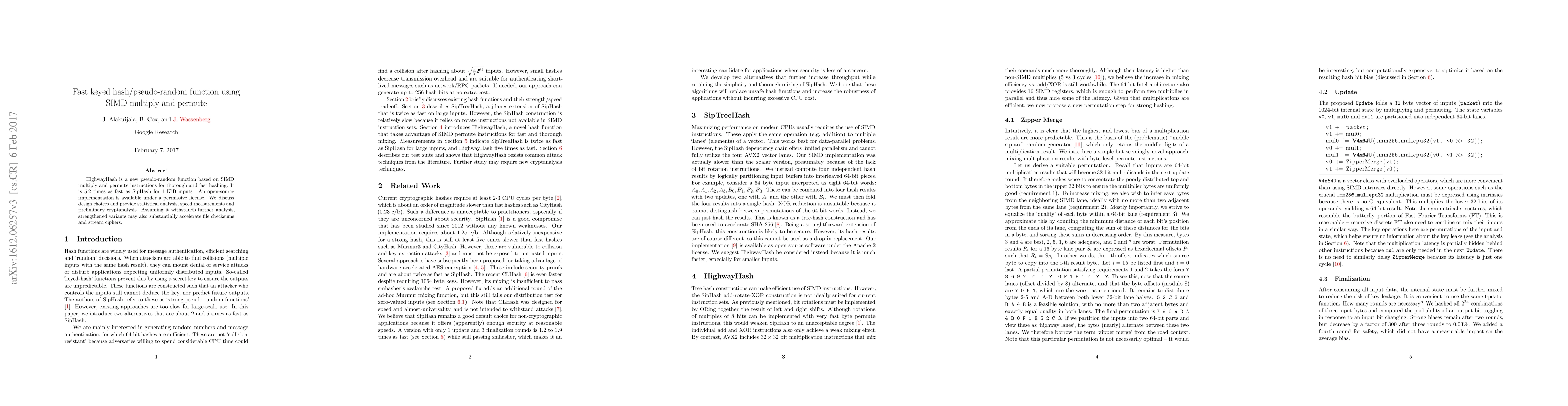 HighwayHash is a fast pseudo-random function that is 5.2 times faster than SipHash for 1 KiB inputs, with potential applications in file checksums and stream ciphers.