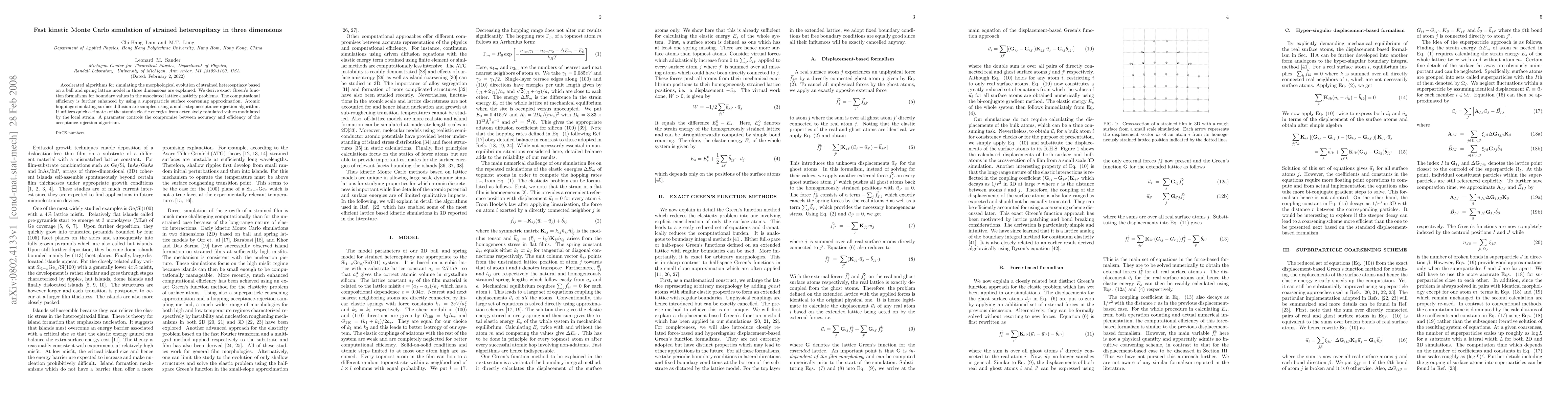 Accelerated algorithms for simulating the morphological evolution of strained heteroeptiaxy based on a ball and spring lattice model in three dimensions are explained. We derive exact Green's function formalisms for boundary values in the associated lattice elasticity problems. The computational efficiency is further enhanced by using a superparticle surface coarsening approximation. Atomic hoppings simulating surface diffusion are sampled using a multi-step acceptance-rejection algorithm. It utilizes quick estimates of the atomic elastic energies from extensively tabulated values modulated by the local strain. A parameter controls the compromise between accuracy and efficiency of the acceptance-rejection algorithm.