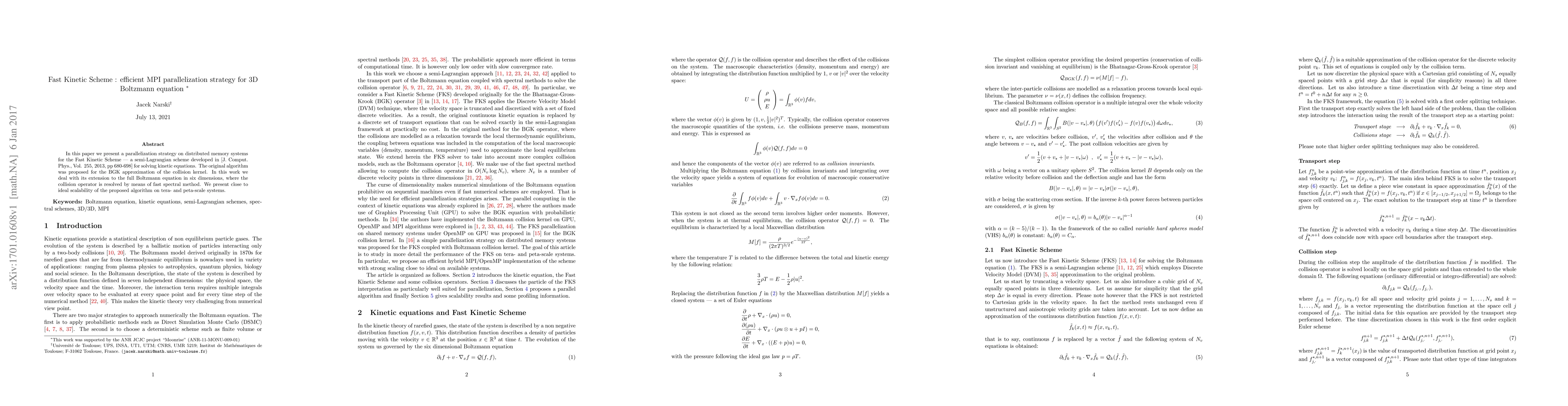 In this paper we present a parallelization strategy on distributed memory systems for the Fast Kinetic Scheme --- a semi-Lagrangian scheme developed in [J. Comput. Phys., Vol. 255, 2013, pp 680-698] for solving kinetic equations. The original algorithm was proposed for the BGK approximation of the collision kernel. In this work we deal with its extension to the full Boltzmann equation in six dimensions, where the collision operator is resolved by means of fast spectral method. We present close to ideal scalability of the proposed algorithm on tera- and peta-scale systems.