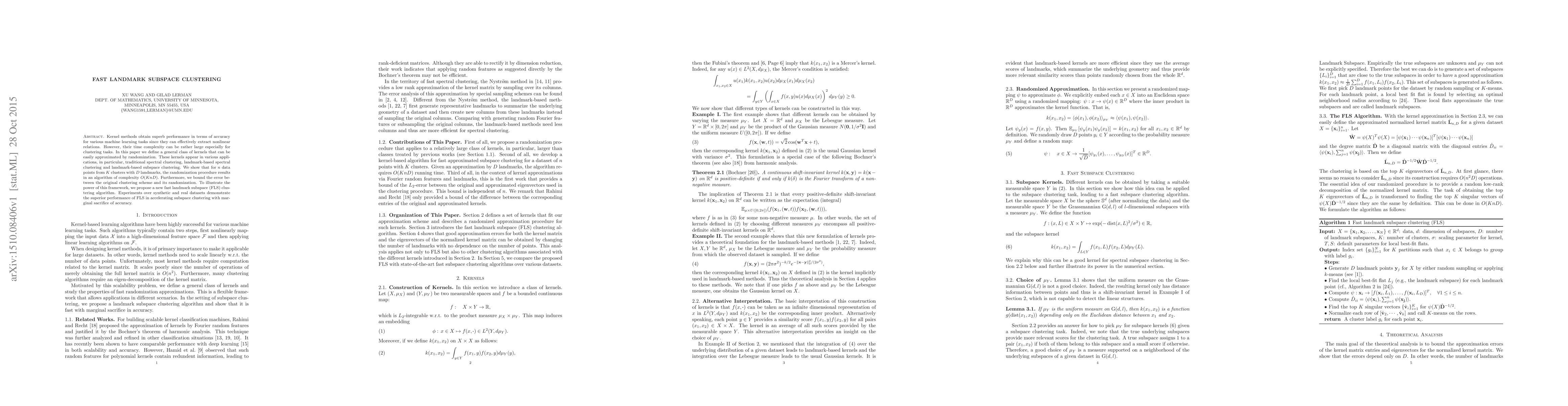 This paper introduces a fast approximation method for landmark subspace clustering using randomized kernels, achieving a complexity of $O(KnD)$ while maintaining accuracy. The proposed Fast Landmark Subspace (FLS) clustering algorithm demonstrates superior performance on both synthetic and real datasets.