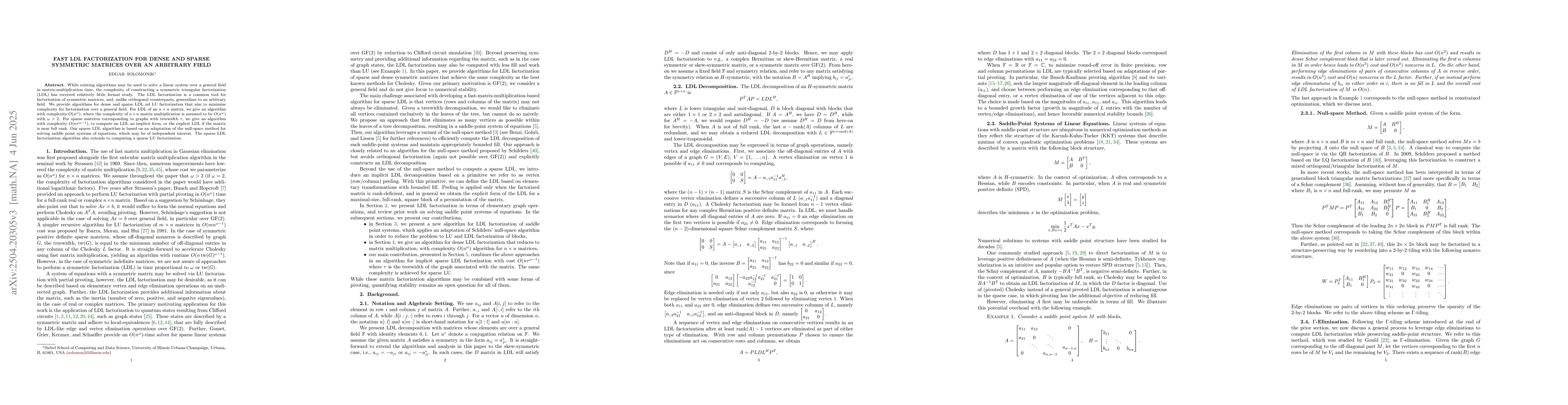 The paper presents algorithms for dense and sparse LDL factorization, as well as dense LU factorization, aiming to minimize complexity over a general field.