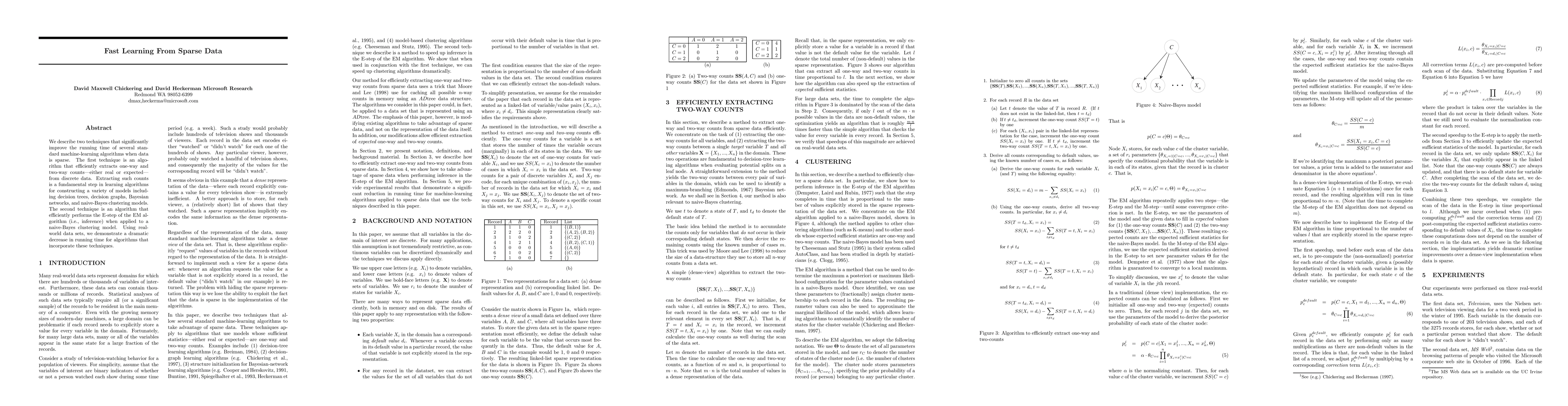 We describe two techniques that significantly improve the running time of several standard machine-learning algorithms when data is sparse. The first technique is an algorithm that effeciently extracts one-way and two-way counts--either real or expected-- from discrete data. Extracting such counts is a fundamental step in learning algorithms for constructing a variety of models including decision trees, decision graphs, Bayesian networks, and naive-Bayes clustering models. The second technique is an algorithm that efficiently performs the E-step of the EM algorithm (i.e. inference) when applied to a naive-Bayes clustering model. Using real-world data sets, we demonstrate a dramatic decrease in running time for algorithms that incorporate these techniques.