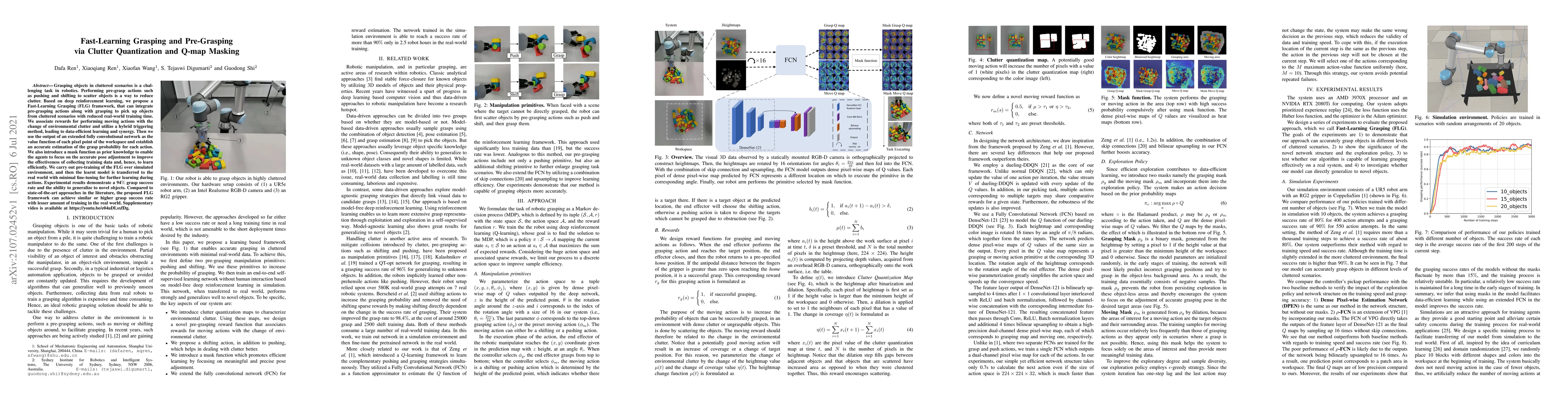 This paper proposes a Fast-Learning Grasping (FLG) framework using deep reinforcement learning to efficiently grasp objects in cluttered environments by integrating pre-grasp actions. The method achieves high grasp success rates with minimal real-world training through clutter quantization, Q-map masking, and pre-training in a simulated environment.