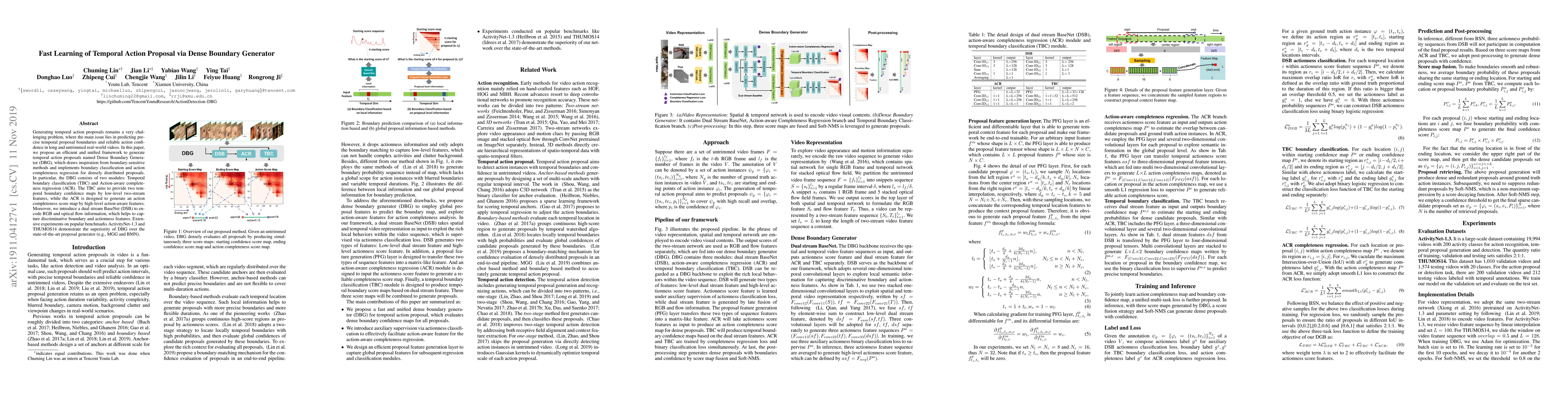 This paper introduces the Dense Boundary Generator (DBG) framework to efficiently generate precise temporal action proposals in long untrimmed videos. The DBG employs a Temporal boundary classification (TBC) module and an Action-aware completeness regression (ACR) module to predict dense boundaries and action confidence, outperforming existing methods on ActivityNet-1.3 and THUMOS14 benchmarks.