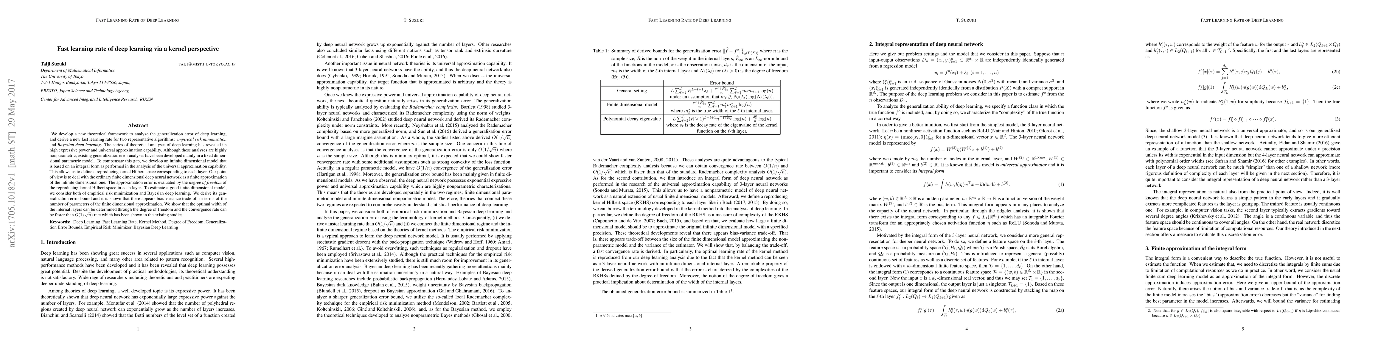 This paper develops a theoretical framework to analyze the generalization error of deep learning using a kernel perspective, deriving a new fast learning rate for empirical risk minimization and Bayesian deep learning. It proposes an infinite dimensional model to bridge nonparametric and parametric analyses, showing a bias-variance trade-off and a faster convergence rate than previously established $O(1/\sqrt{n})$ rate.