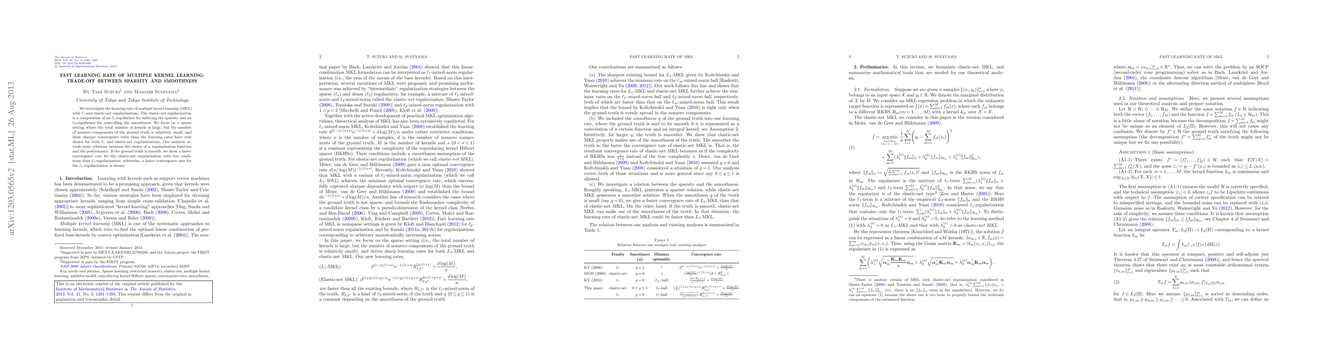 This paper explores the learning rate of multiple kernel learning (MKL) with $\ell_1$ and elastic-net regularizations, demonstrating faster convergence rates in sparse settings. It reveals that elastic-net regularization achieves faster convergence for smooth ground truths under fewer conditions compared to $\ell_1$-regularization, which is more effective when the ground truth is sparse.