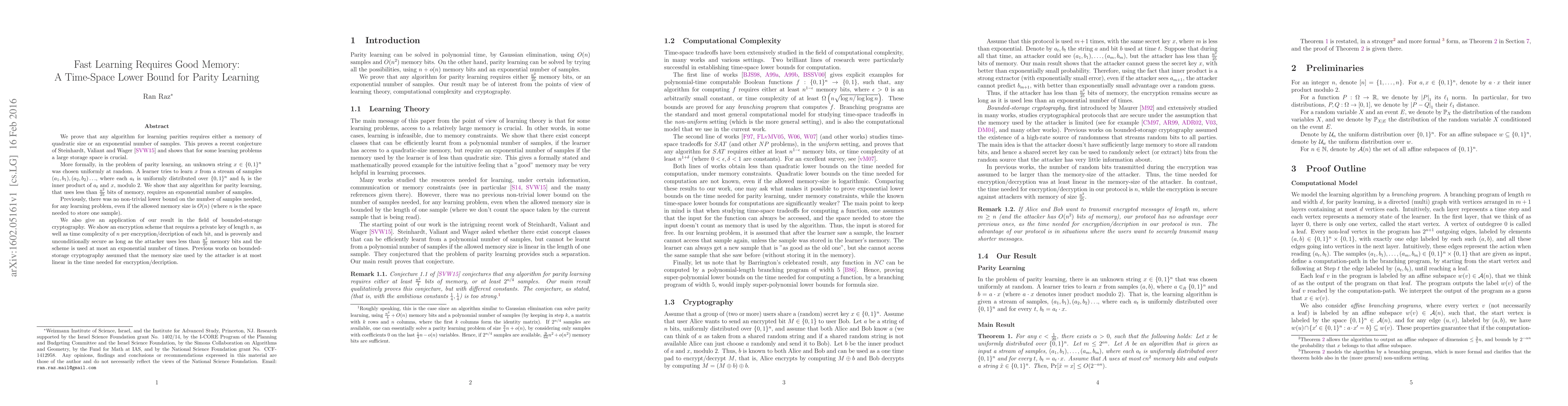 We prove that any algorithm for learning parities requires either a memory of quadratic size or an exponential number of samples. This proves a recent conjecture of Steinhardt, Valiant and Wager and shows that for some learning problems a large storage space is crucial. More formally, in the problem of parity learning, an unknown string $x \in \{0,1\}^n$ was chosen uniformly at random. A learner tries to learn $x$ from a stream of samples $(a_1, b_1), (a_2, b_2) \ldots$, where each~$a_t$ is uniformly distributed over $\{0,1\}^n$ and $b_t$ is the inner product of $a_t$ and $x$, modulo~2. We show that any algorithm for parity learning, that uses less than $\frac{n^2}{25}$ bits of memory, requires an exponential number of samples. Previously, there was no non-trivial lower bound on the number of samples needed, for any learning problem, even if the allowed memory size is $O(n)$ (where $n$ is the space needed to store one sample). We also give an application of our result in the field of bounded-storage cryptography. We show an encryption scheme that requires a private key of length $n$, as well as time complexity of $n$ per encryption/decription of each bit, and is provenly and unconditionally secure as long as the attacker uses less than $\frac{n^2}{25}$ memory bits and the scheme is used at most an exponential number of times. Previous works on bounded-storage cryptography assumed that the memory size used by the attacker is at most linear in the time needed for encryption/decription.