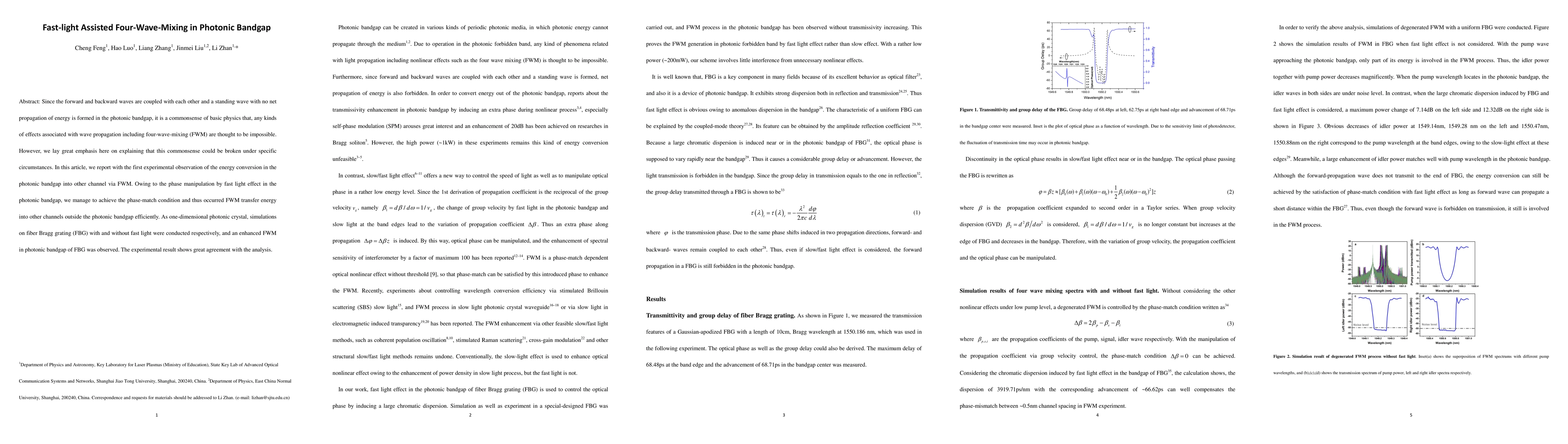 Since the forward and backward waves are coupled with each other and a standing wave with no net propagation of energy is formed in the photonic bandgap, it is a commonsense of basic physics that, any kinds of effects associated with wave propagation including four-wave-mixing (FWM) are thought to be impossible. However, we lay great emphasis here on explaining that this commonsense could be broken under specific circumstances. In this article, we report with the first experimental observation of the energy conversion in the photonic bandgap into other channel via FWM. Owing to the phase manipulation by fast light effect in the photonic bandgap, we manage to achieve the phase-match condition and thus occurred FWM transfer energy into other channels outside the photonic bandgap efficiently. As one-dimensional photonic crystal, simulations on fiber Bragg grating (FBG) with and without fast light were conducted respectively, and an enhanced FWM in photonic bandgap of FBG was observed. The experimental result shows great agreement with the analysis.