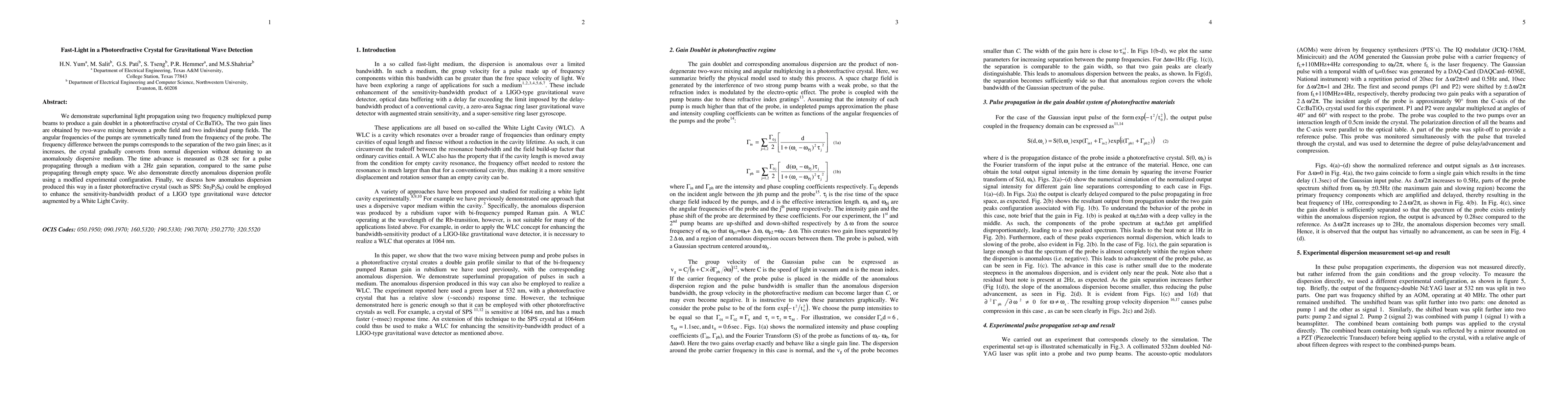 This paper demonstrates superluminal light propagation in a photorefractive crystal of Ce:BaTiO3, achieving a time advance of 0.28 seconds by using two frequency multiplexed pump beams to create anomalous dispersion. The potential application of this technique in enhancing the sensitivity-bandwidth product of gravitational wave detectors is also discussed.