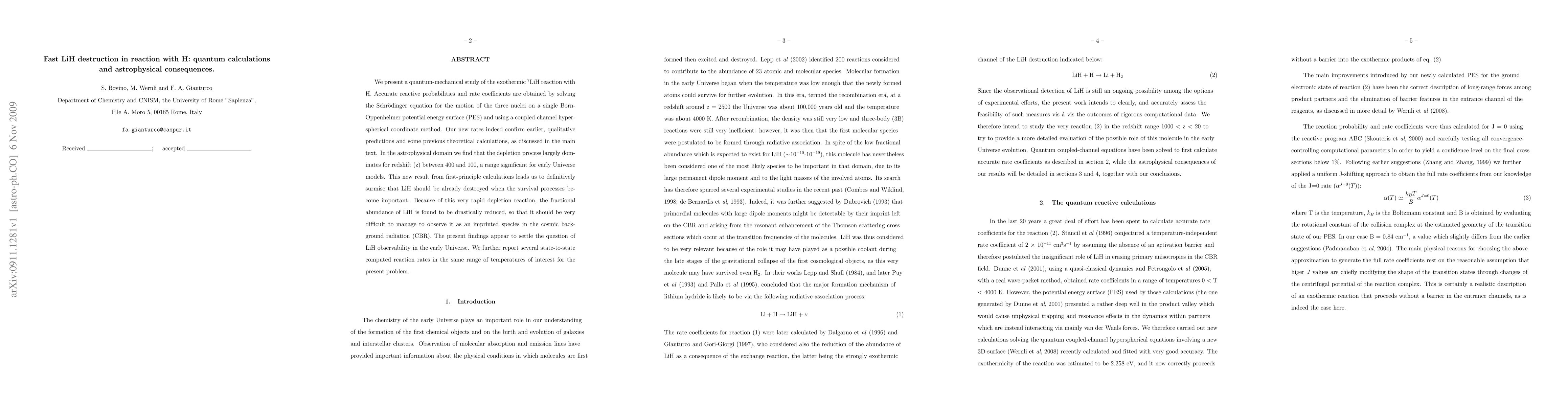 We present a quantum-mechanical study of the exothermic 7LiH reaction with H. Accurate reactive probabilities and rate coefficients are obtained by solving the Schrodinger equation for the motion of the three nuclei on a single Born-Oppenheimer potential energy surface (PES) and using a coupled-channel hyperspherical coordinate method. Our new rates indeed confirm earlier, qualitative predictions and some previous theoretical calculations, as discussed in the main text. In the astrophysical domain we find that the depletion process largely dominates for redshift (z) between 400 and 100, a range significant for early Universe models. This new result from first-principle calculations leads us to definitively surmise that LiH should be already destroyed when the survival processes become important. Because of this very rapid depletion reaction, the fractional abundance of LiH is found to be drastically reduced, so that it should be very difficult to manage to observe it as an imprinted species in the cosmic background radiation (CBR). The present findings appear to settle the question of LiH observability in the early Universe. We further report several state-to-state computed reaction rates in the same range of temperatures of interest for the present problem.