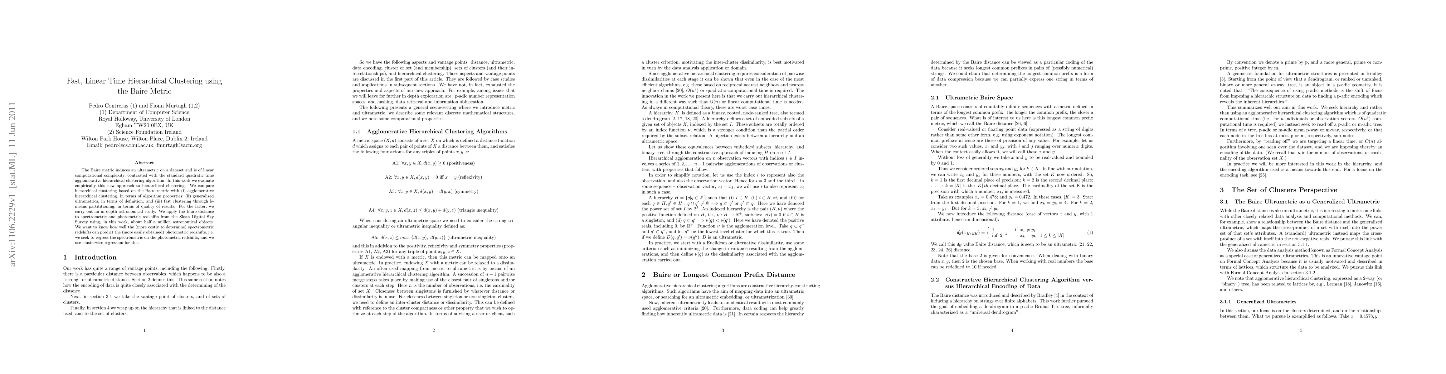 This paper proposes a fast, linear time hierarchical clustering method using the Baire metric, which induces an ultrametric on datasets, and compares it to agglomerative hierarchical clustering, generalized ultrametrics, and k-means partitioning. An in-depth astronomical study is conducted to assess the method's effectiveness in predicting photometric redshifts from spectrometric data.
