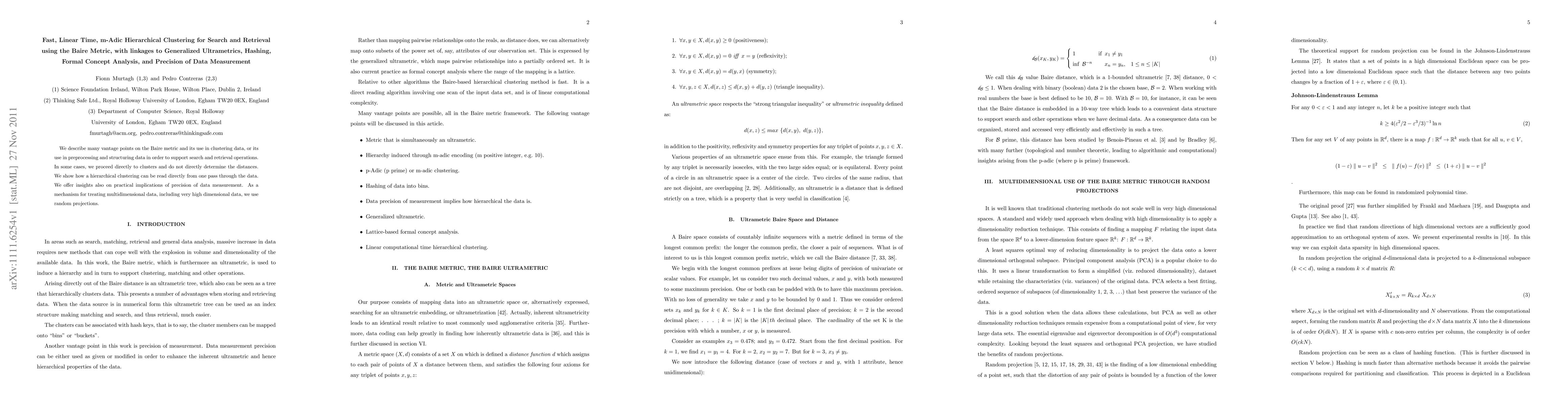 This paper presents a fast, linear time, m-adic hierarchical clustering method using the Baire metric for efficient search and retrieval, linking it to generalized ultrametrics, hashing, and formal concept analysis. It also discusses the precision of data measurement and employs random projections for handling high-dimensional data.