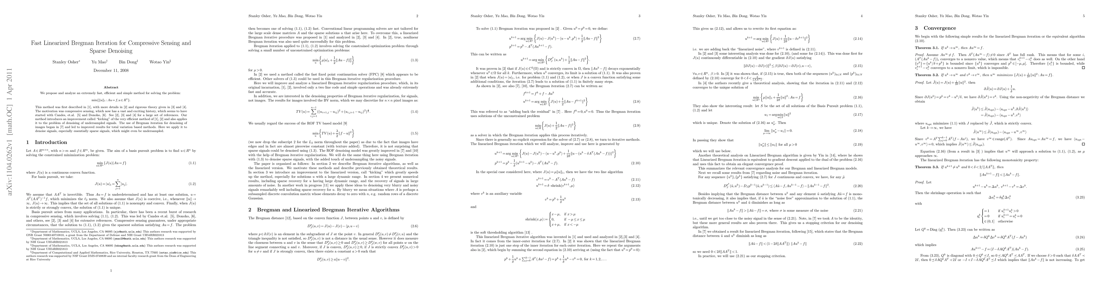 We propose and analyze an extremely fast, efficient, and simple method for solving the problem:min{parallel to u parallel to(1) : Au = f, u is an element of R-n}.This method was first described in [J. Darbon and S. Osher, preprint, 2007], with more details in [W. Yin, S. Osher, D. Goldfarb and J. Darbon, SIAM J. Imaging Sciences, 1(1), 143-168, 2008] and rigorous theory given in [J. Cai, S. Osher and Z. Shen, Math. Comp., to appear, 2008, see also UCLA CAM Report 08-06] and [J. Cai, S. Osher and Z. Shen, UCLA CAM Report, 08-52, 2008]. The motivation was compressive sensing, which now has a vast and exciting history, which seems to have started with Candes, et. al. [E. Candes, J. Romberg and T. Tao, 52(2), 489-509, 2006] and Donoho, [D. L. Donoho, IEEE Trans. Inform. Theory, 52, 1289-1306, 2006]. See [W. Yin, S. Osher, D. Goldfarb and J. Darbon, SIAM J. Imaging Sciences 1(1), 143-168, 2008] and [J. Cai, S. Osher and Z. Shen, Math. Comp., to appear, 2008, see also UCLA CAM Report, 08-06] and [J. Cai, S. Osher and Z. Shen, UCLA CAM Report, 08-52, 2008] for a large set of references. Our method introduces an improvement called "kicking" of the very efficient method of [J. Darbon and S. Osher, preprint, 2007] and [W. Yin, S. Osher, D. Goldfarb and J. Darbon, SIAM J. Imaging Sciences, 1(1), 143-168, 2008] and also applies it to the problem of denoising of undersampled signals. The use of Bregman iteration for denoising of images began in [S. Osher, M. Burger, D. Goldfarb, J. Xu and W. Yin, Multiscale Model. Simul, 4(2), 460-489, 2005] and led to improved results for total variation based methods. Here we apply it to denoise signals, especially essentially sparse signals, which might even be undersampled.