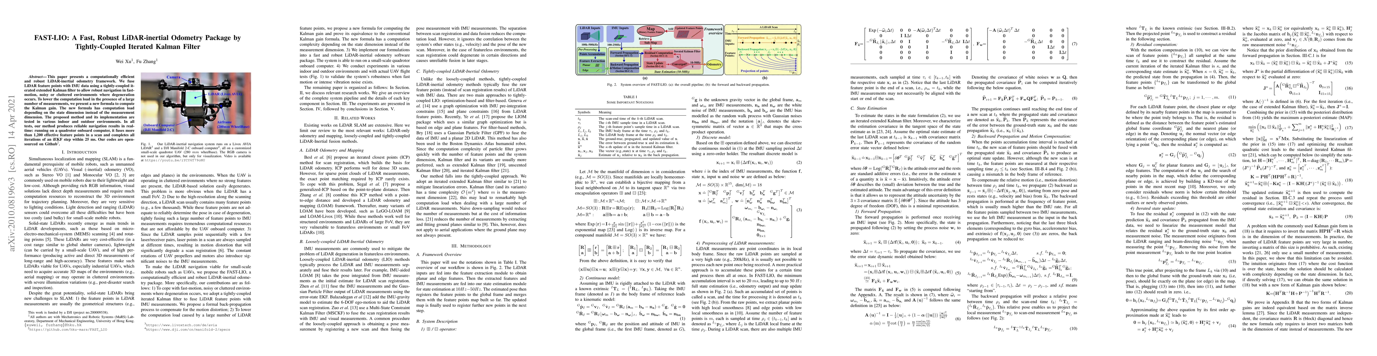 This paper introduces FAST-LIO, a fast and robust LiDAR-inertial odometry package that uses a tightly-coupled iterated extended Kalman filter to fuse LiDAR and IMU data for real-time navigation in dynamic environments. The method employs a novel Kalman gain formula to reduce computational load, enabling reliable performance on a quadrotor.