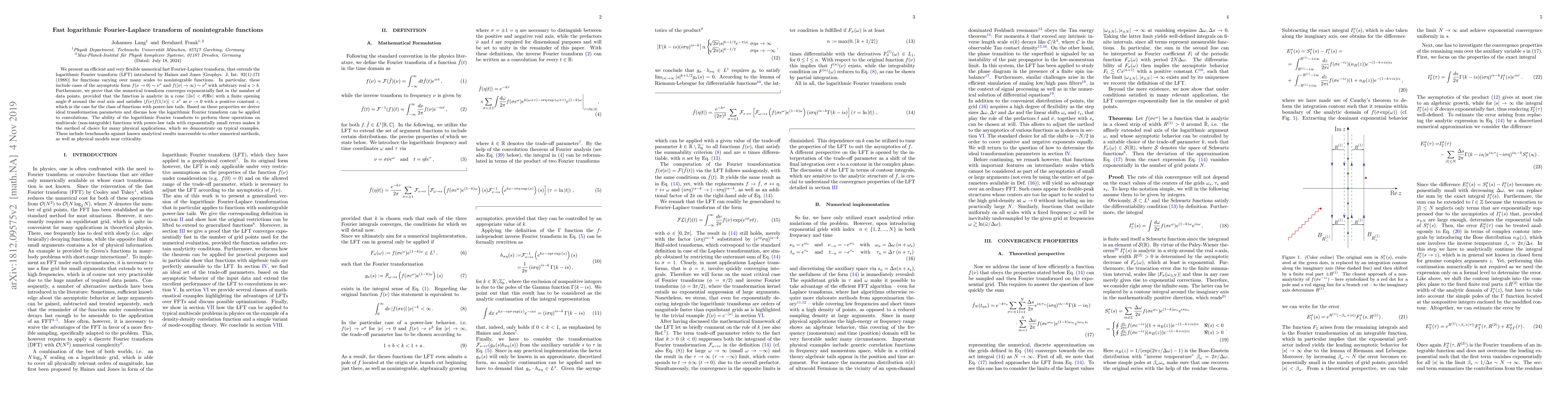 We present an efficient and very flexible numerical fast Fourier-Laplace transform, that extends the logarithmic Fourier transform (LFT) introduced by Haines and Jones [Geophys. J. Int. 92(1):171 (1988)] for functions varying over many scales to nonintegrable functions. In particular, these include cases of the asymptotic form $f(\nu\to0)\sim\nu^a$ and $f(|\nu|\to\infty)\sim\nu^b$ with arbitrary real $a>b$. Furthermore, we prove that the numerical transform converges exponentially fast in the number of data points, provided that the function is analytic in a cone $|\Im{\nu}|<\theta|\Re{\nu}|$ with a finite opening angle $\theta$ around the real axis and satisfies $|f(\nu)f(1/\nu)|<\nu^c$ as $\nu\to 0$ with a positive constant $c$, which is the case for the class of functions with power-law tails. Based on these properties we derive ideal transformation parameters and discuss how the logarithmic Fourier transform can be applied to convolutions. The ability of the logarithmic Fourier transform to perform these operations on multiscale (non-integrable) functions with power-law tails with exponentially small errors makes it the method of choice for many physical applications, which we demonstrate on typical examples. These include benchmarks against known analytical results inaccessible to other numerical methods, as well as physical models near criticality.