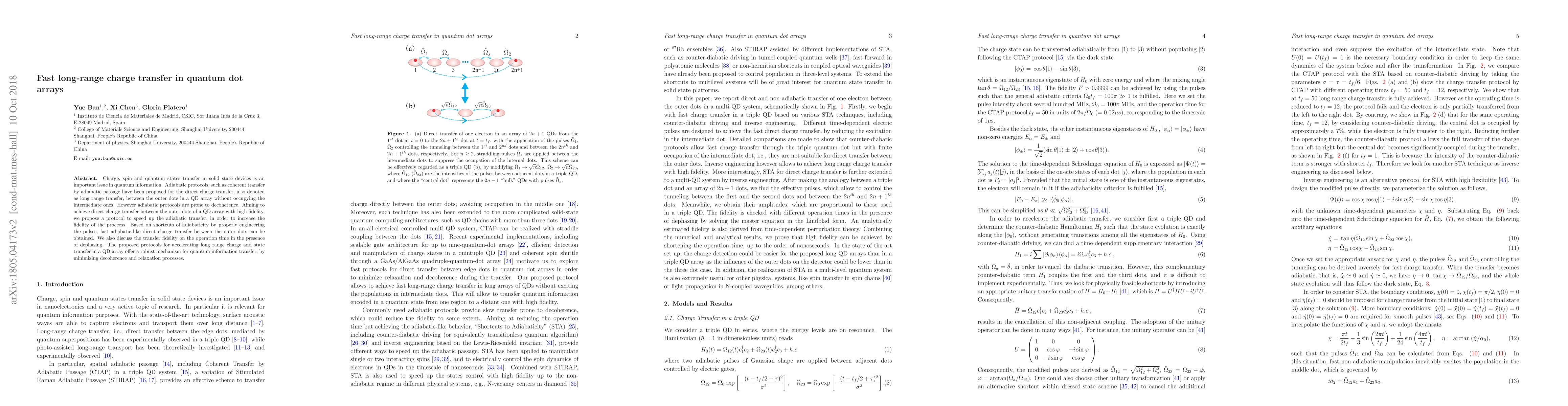 This paper proposes a protocol using "Shortcuts to Adiabaticity" to accelerate adiabatic charge transfer in quantum dot arrays, significantly reducing decoherence and improving the fidelity of quantum information processing. The method successfully speeds up direct transfer between edge dots in triple quantum dots and extends to multi-dot systems, minimizing intermediate dot population.