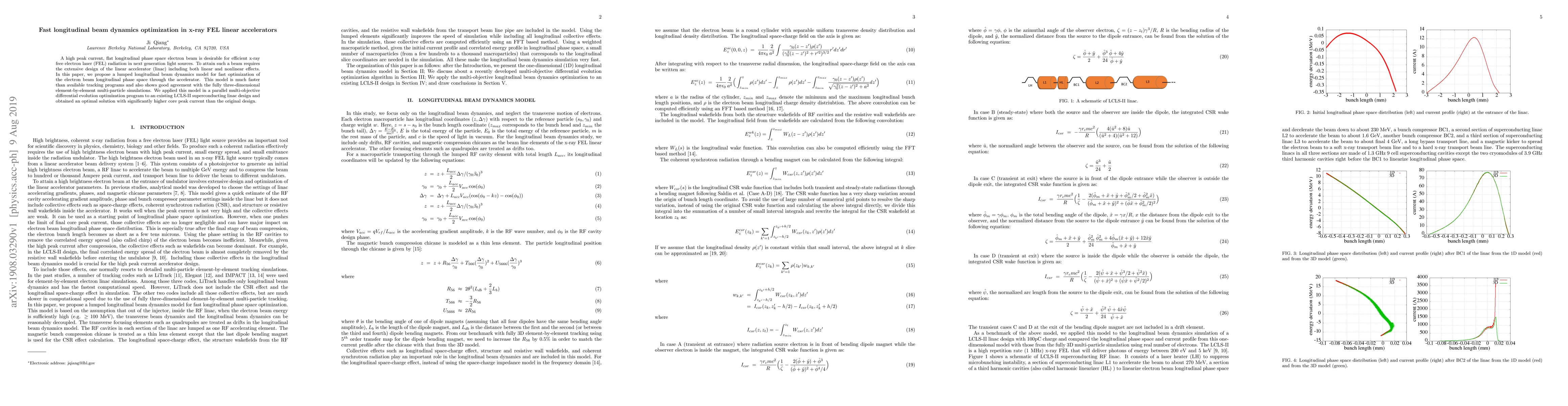 This paper proposes a fast lumped longitudinal beam dynamics model for optimizing electron beam phase space in x-ray FEL linear accelerators, achieving higher peak current than the original design. The model is faster than existing tracking programs and aligns well with detailed multi-particle simulations.