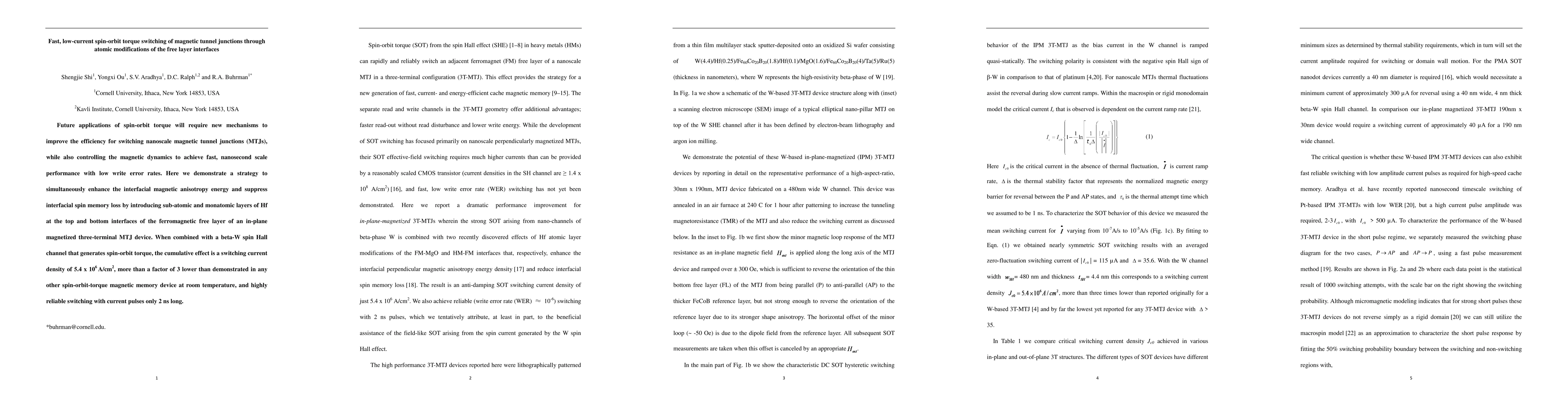 This research introduces atomic layer modifications of Hf at the interfaces of magnetic tunnel junctions to enhance switching efficiency and reduce current density. The method enables fast switching with nanosecond pulses and significantly lower current density, improving the performance and reliability of spin-orbit torque magnetic memory devices.