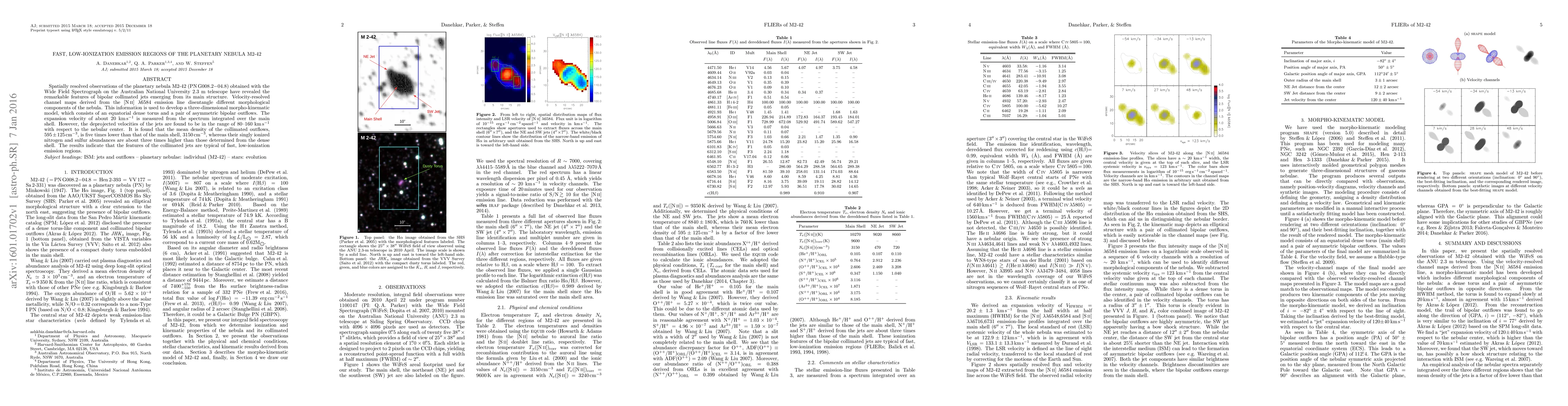 Spatially resolved observations of the planetary nebula M2-42 (PN G008.2-04.8) obtained with the Wide Field Spectrograph on the Australian National University 2.3 m telescope have revealed the remarkable features of bipolar collimated jets emerging from its main structure. Velocity-resolved channel maps derived from the [N II] $\lambda$6584 emission line disentangle different morphological components of the nebula. This information is used to develop a three-dimensional morpho-kinematic model, which consists of an equatorial dense torus and a pair of asymmetric bipolar outflows. The expansion velocity of about 20 km s$^{-1}$ is measured from the spectrum integrated over the main shell. However, the deprojected velocities of the jets are found to be in the range of 80-160 km s$^{-1}$ with respect to the nebular center. It is found that the mean density of the collimated outflows, 595 $\pm$ 125 cm$^{-3}$, is five times lower than that of the main shell, 3150 cm$^{-3}$, whereas their singly ionized nitrogen and sulfur abundances are about three times higher than those determined from the dense shell. The results indicate that the features of the collimated jets are typical of fast, low-ionization emission regions.