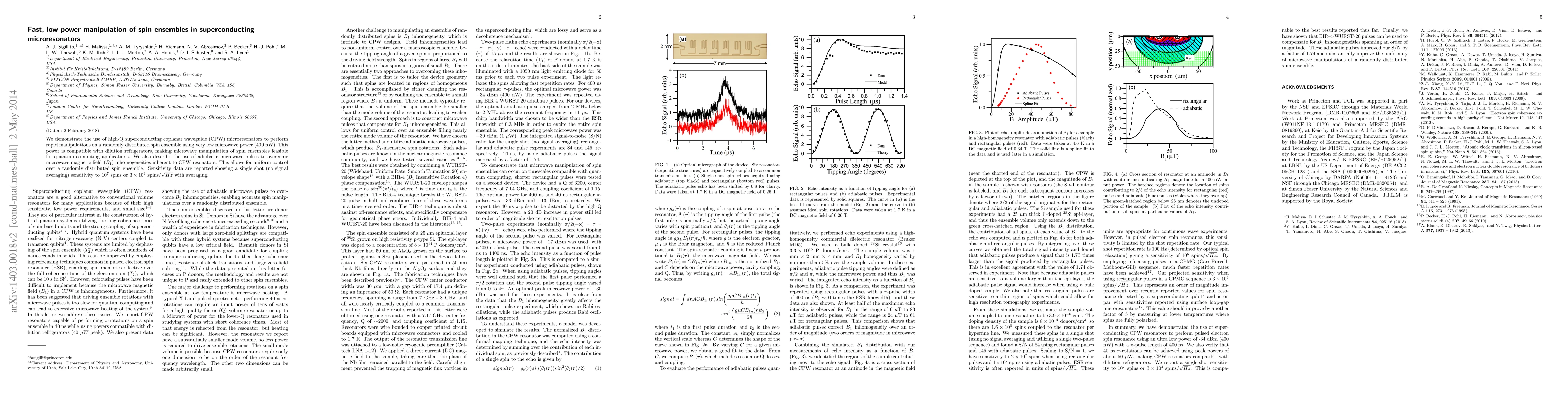 This paper demonstrates rapid, low-power manipulation of spin ensembles in superconducting microresonators using high-Q coplanar waveguide resonators, achieving control with 400 nW compatible with dilution refrigerators. The use of adiabatic microwave pulses addresses $B_{1}$ inhomogeneities, enabling uniform control over spin ensembles for quantum computing applications.
