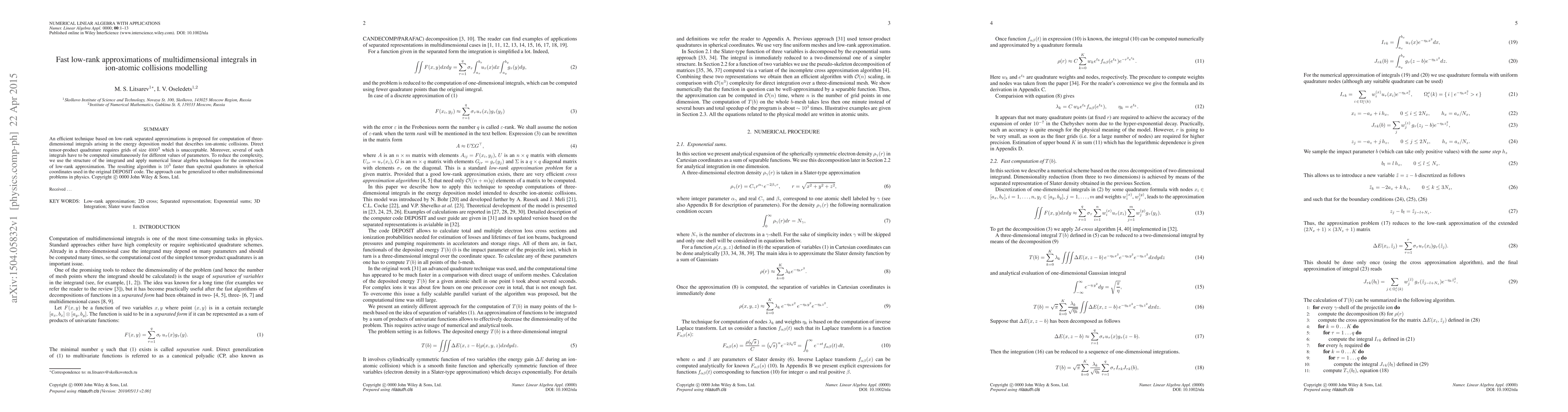 This paper proposes a low-rank approximation method to efficiently compute three-dimensional integrals in ion-atomic collision models, significantly reducing the computational complexity compared to traditional tensor-product quadrature. The new algorithm is over a thousand times faster than previous methods and can be applied to other multidimensional problems in physics.